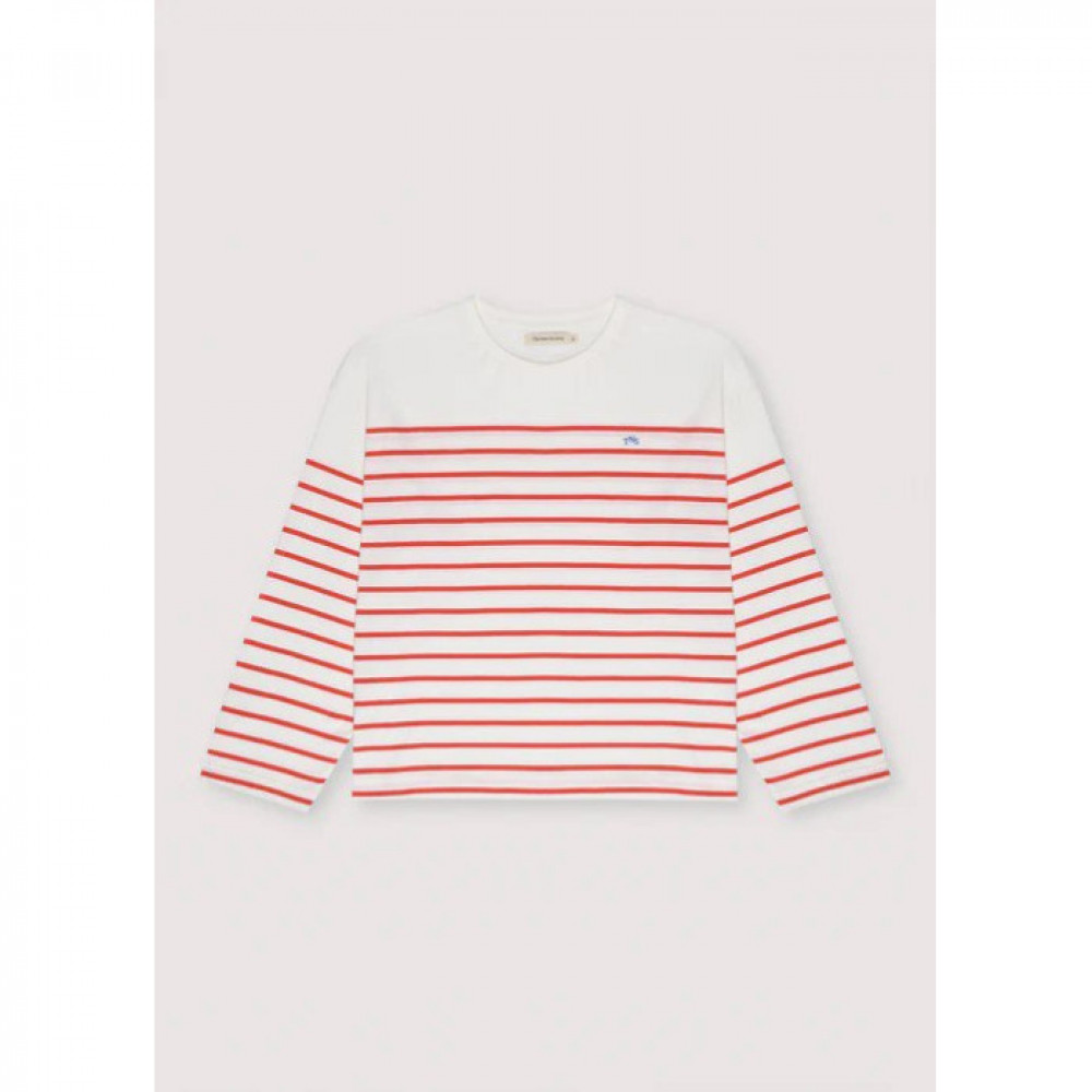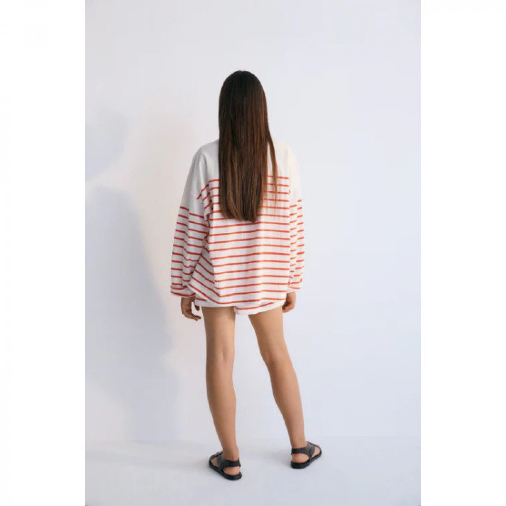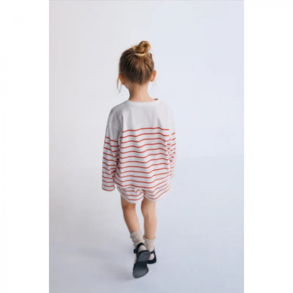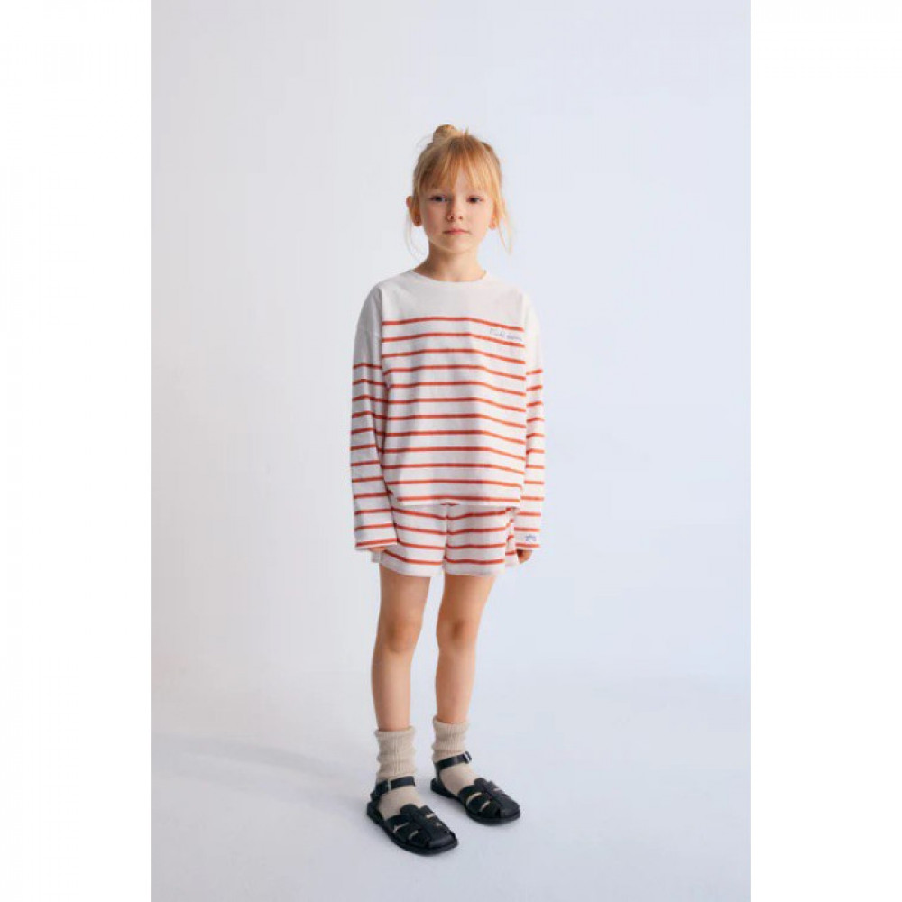 Цей набір у морському стилі легко поєд нує комфорт і стиль. Двоколірна футбол ка в смужку з довгими рукавами має невимушений крій, ребристий комір і грайливу контрастну вишивку на грудях, що додає веселості. У поєднанні з відповідними шортами цей образ ідеально підходить для повсякденного, але елегантного вбрання.