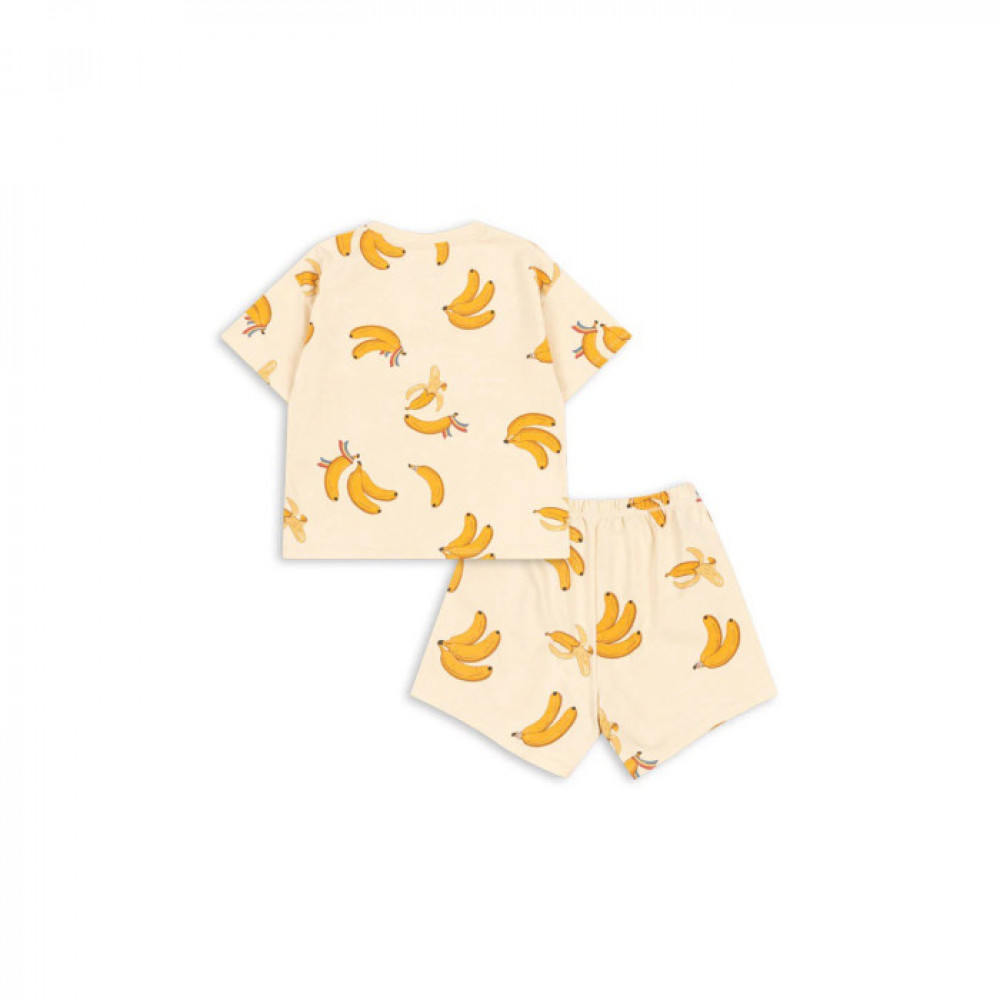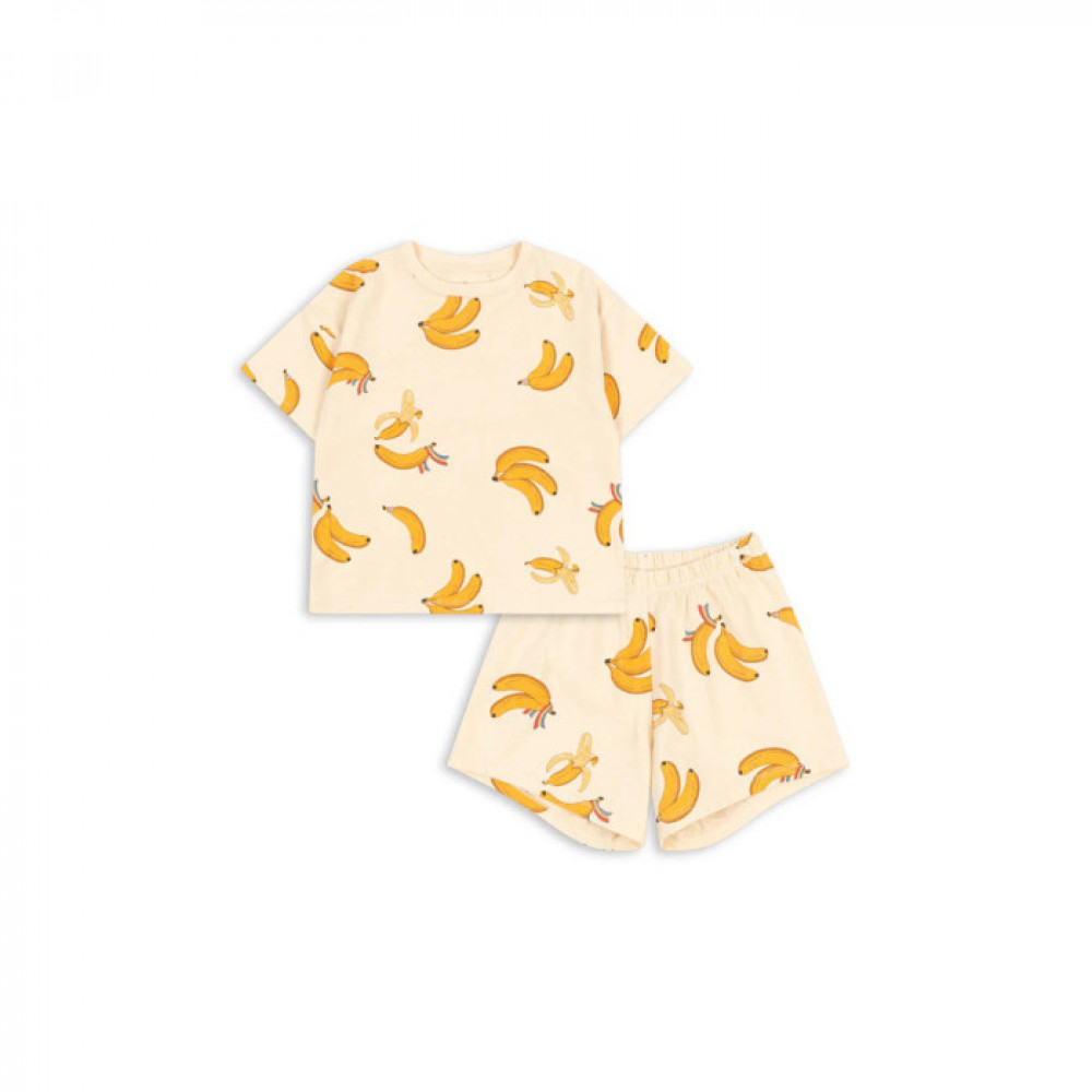 Класичний бавовняний комплект з футболкою з короткими втачними рукавами та м’якими шортами з еластичною талією. Зверніть увагу: для менших розмірів, від 9 до 18 місяців, верх має кнопки на лівому плечі для зручності одягання. Розміри від 2 років мають звичайну круглу горловину з ребрами.