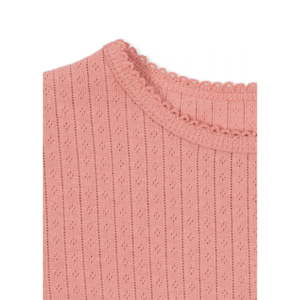 М’яка базова футболка з 10% органічної бавовни з декоративним візерунком пуантелл по всій поверхні та декоративною лінією піко по низу. Мінні – це наша класична лінійка базових речей, виготовлених з м’якої органічної бавовни. Ці речі призначені для носіння як вдень, так і вночі як комфортний шар, щільно прилягаючий до шкіри.