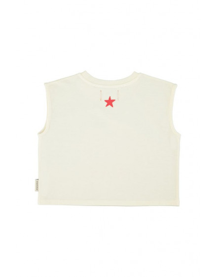 Футболка без рукавів з джерсі полум'яного кольору. Декорований принт спереду та принт з логотипом червоної зірки на спині. Дерев'яні ґудзики на плечі для дитячих розмірів. Прати в холодній воді (макс. 30ºC). Не відбілювати. Не сушити в сушильній машині. Прасувати в прохолодній воді (макс. 110ºC). Не піддавати хімічному чищенню.