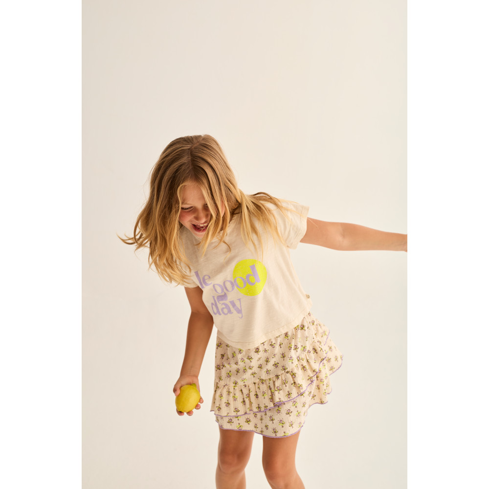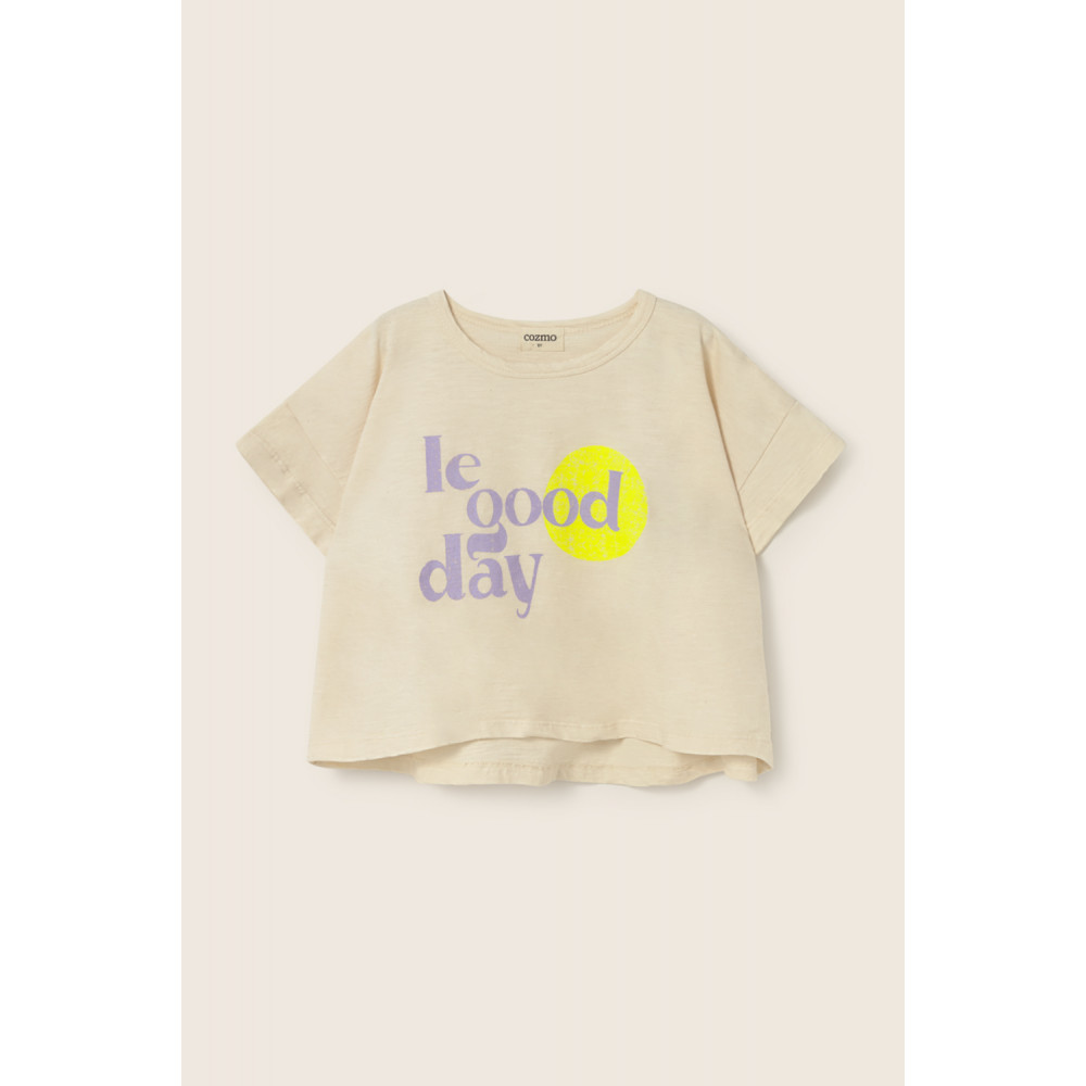 Футболка з принтом, виготовлена з дуже легкої бавовни. Круглий виріз горловини. Короткі рукави. Задній поділ довший за передній. Друкований мотив з написом "le good day".
