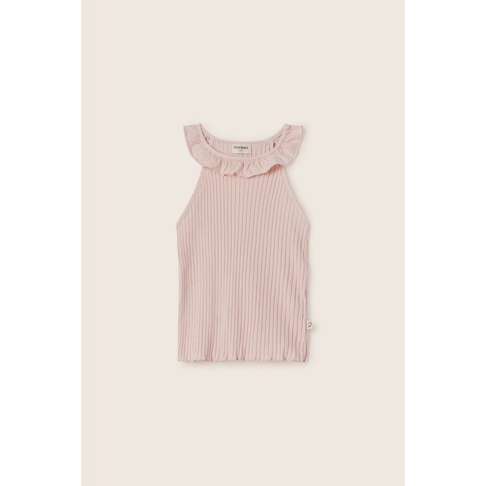 Топ без рукавів з ребристої бавовни. Пройми реглан. Комір з рюшами. Оздоблення листям салатового кольору на горловині та подолу.