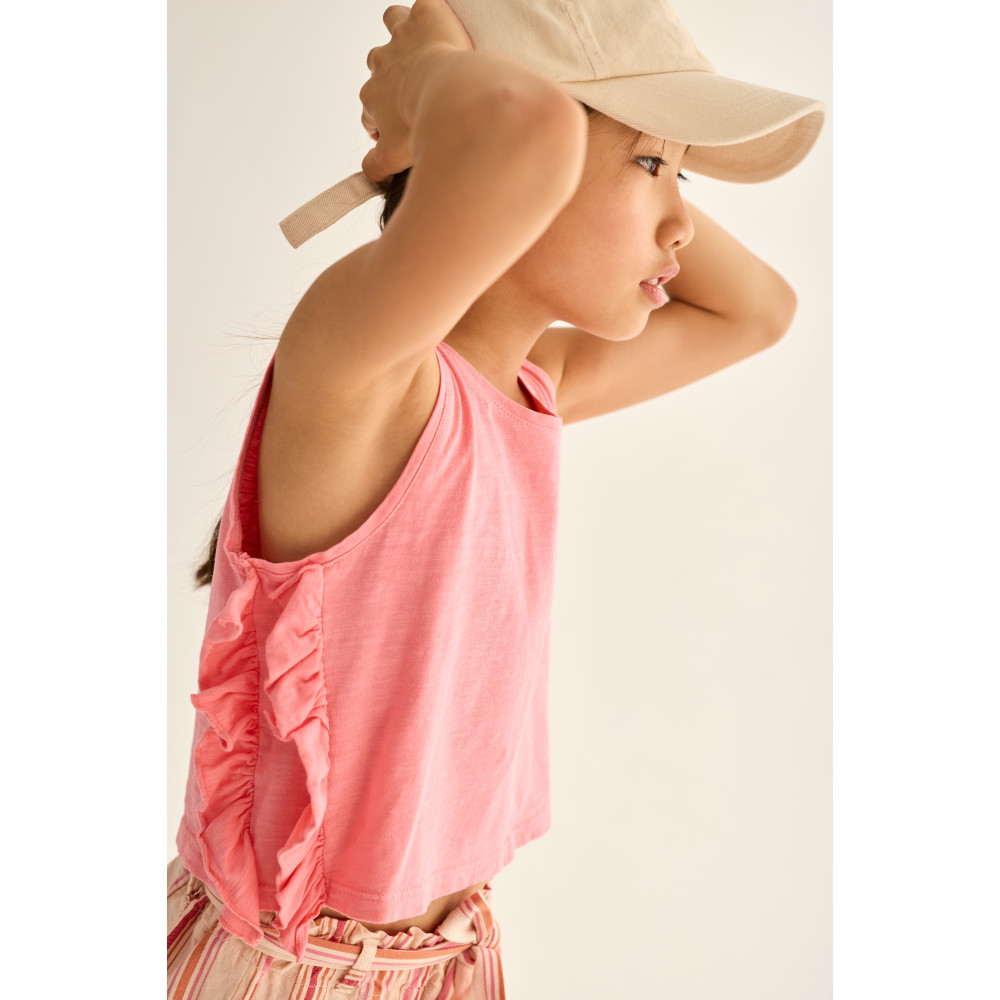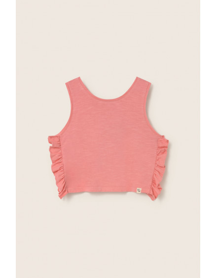 Топ без рукавів з дуже легкої бавовни. Круглий виріз горловини. Зібрані рюші з боків. Злегка укорочений силует.