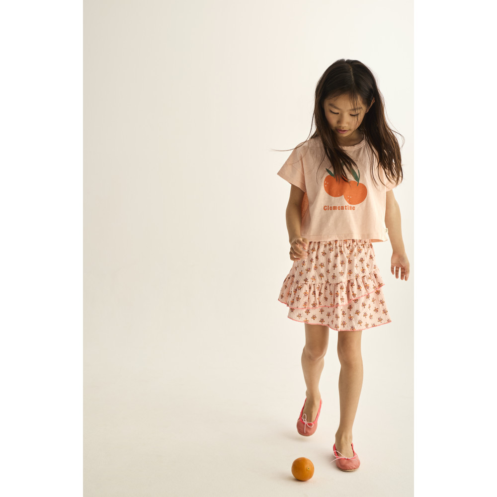 Футболка з принтом, виготовлена з дуже легкої бавовни. Круглий виріз горловини. Короткі рукави. Задній поділ довший і заокруглений. Принтований мотив із двома клементинами та написом "clementine".