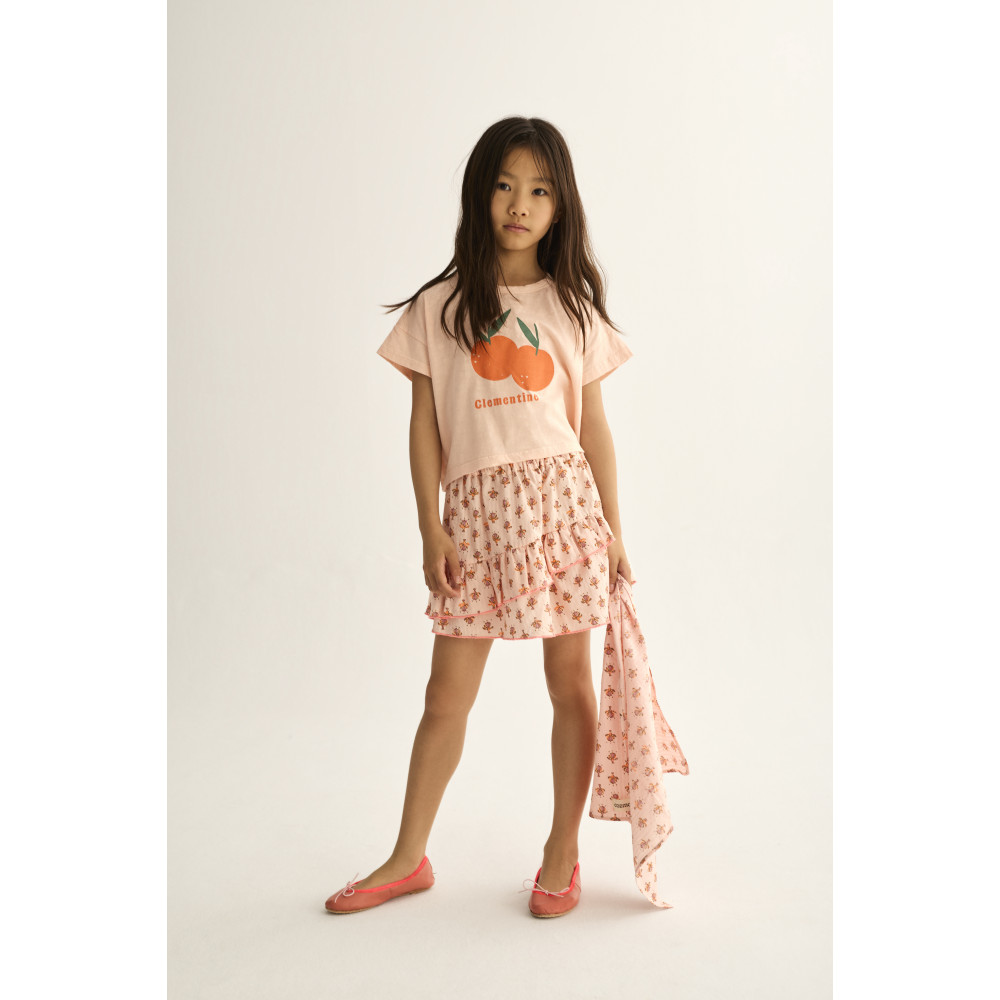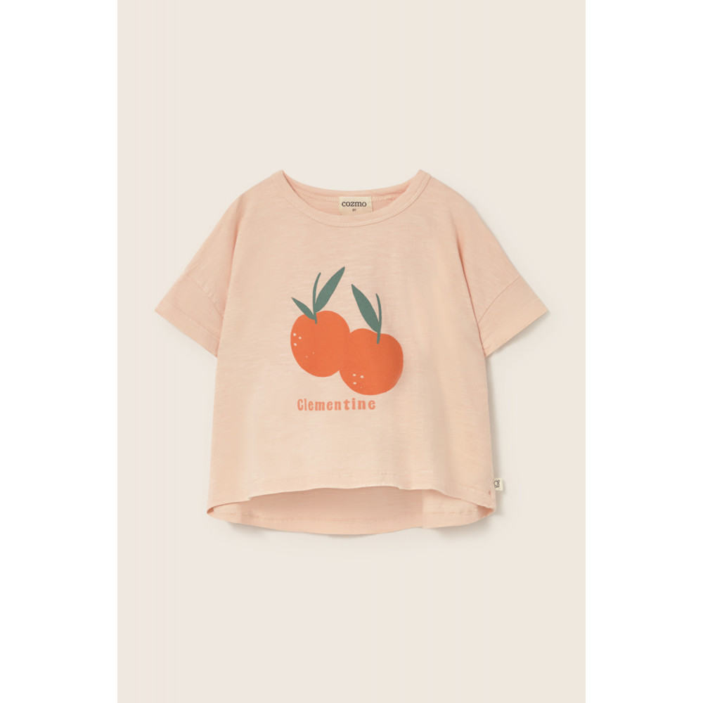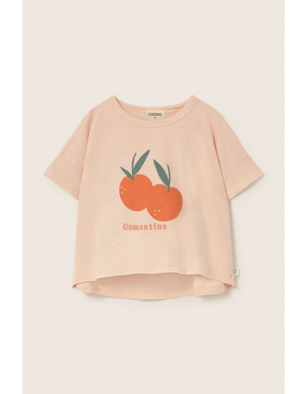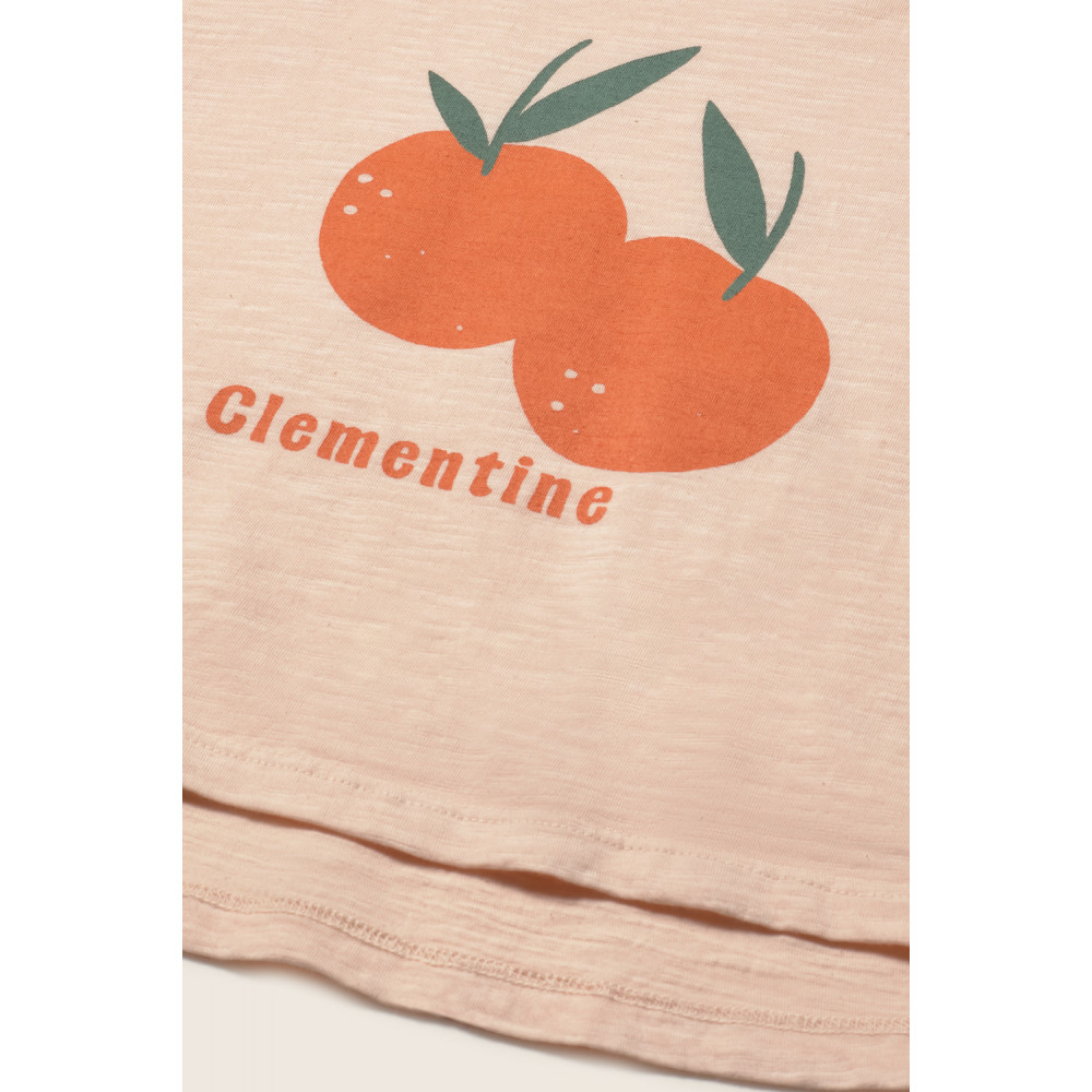 Футболка з принтом, виготовлена з дуже легкої бавовни. Круглий виріз горловини. Короткі рукави. Задній поділ довший і заокруглений. Принтований мотив із двома клементинами та написом "clementine".