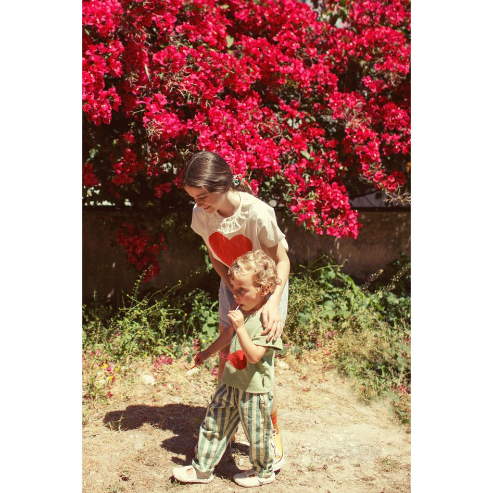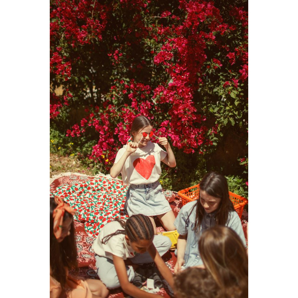 Футболка з джерсі кольору флейме з принтом спереду та круглим коміром. Задня застібка з маленькими дерев'яними ґудзиками для дитячих розмірів. Прати в холодній воді (макс. 30ºC). Не відбілювати. Не сушити в сушильній машині. Прасувати в прохолодній воді (макс. 110ºC). Не піддавати хімічному чищенню.