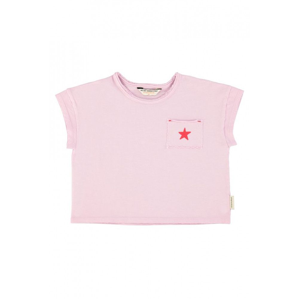 Футболка з джерсі кольору флейме з нагрудною кишенею з необробленим краєм. Декорований принтом червоної зірки на грудях та спині. Дерев'яні ґудзики на плечі для дитячих розмірів. Прати в холодній воді (макс. 30ºC). Не відбілювати. Не сушити в сушильній машині. Прасувати в прохолодній воді (макс. 110ºC). Не піддавати хімічному чищенню.