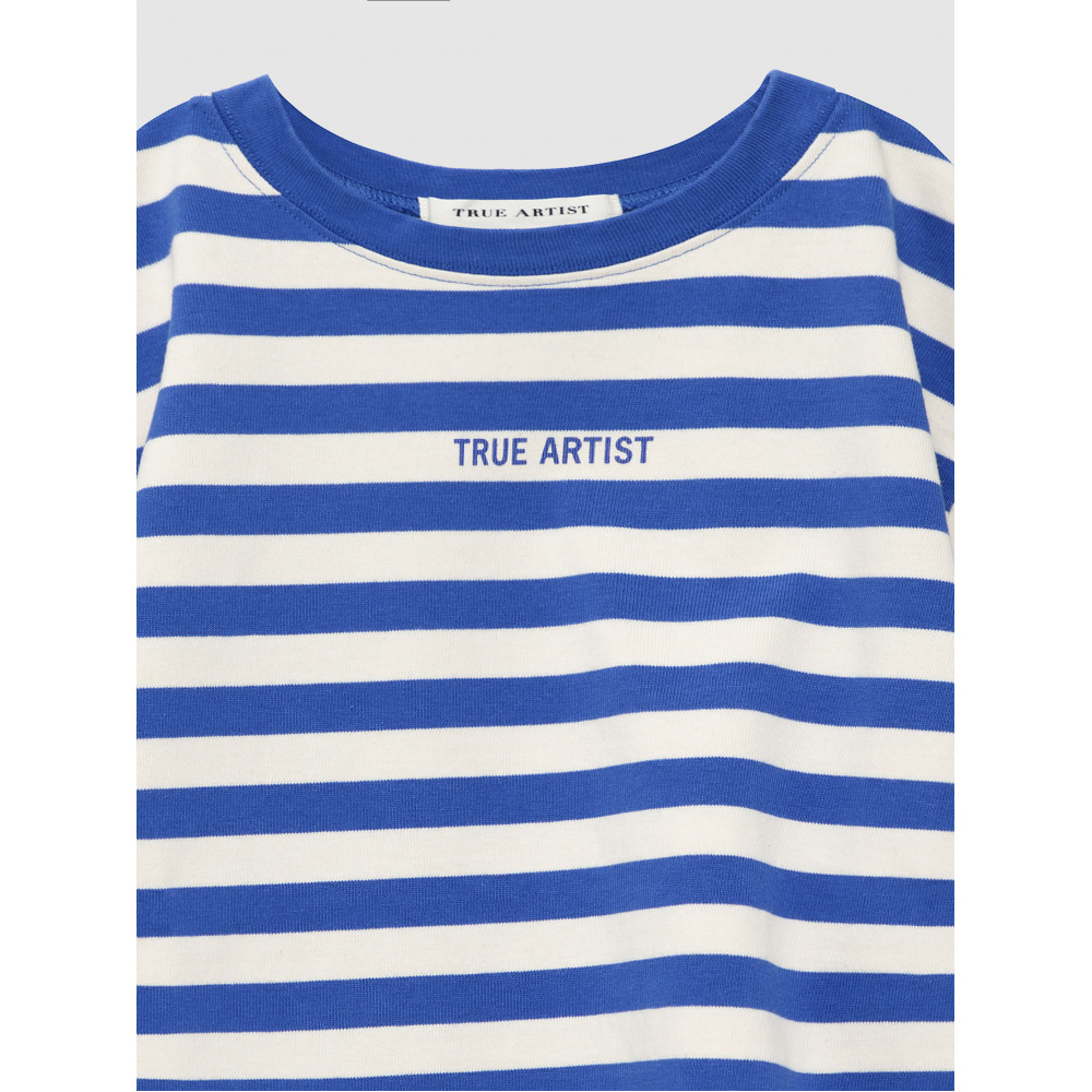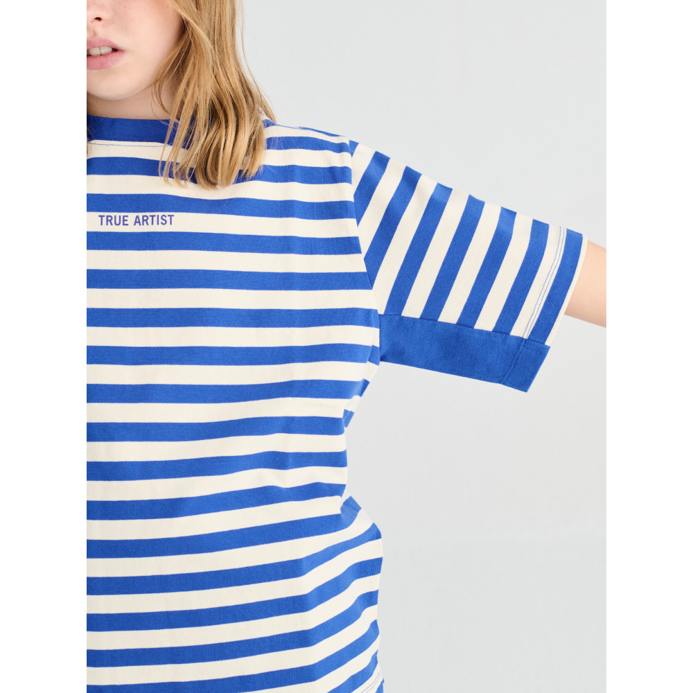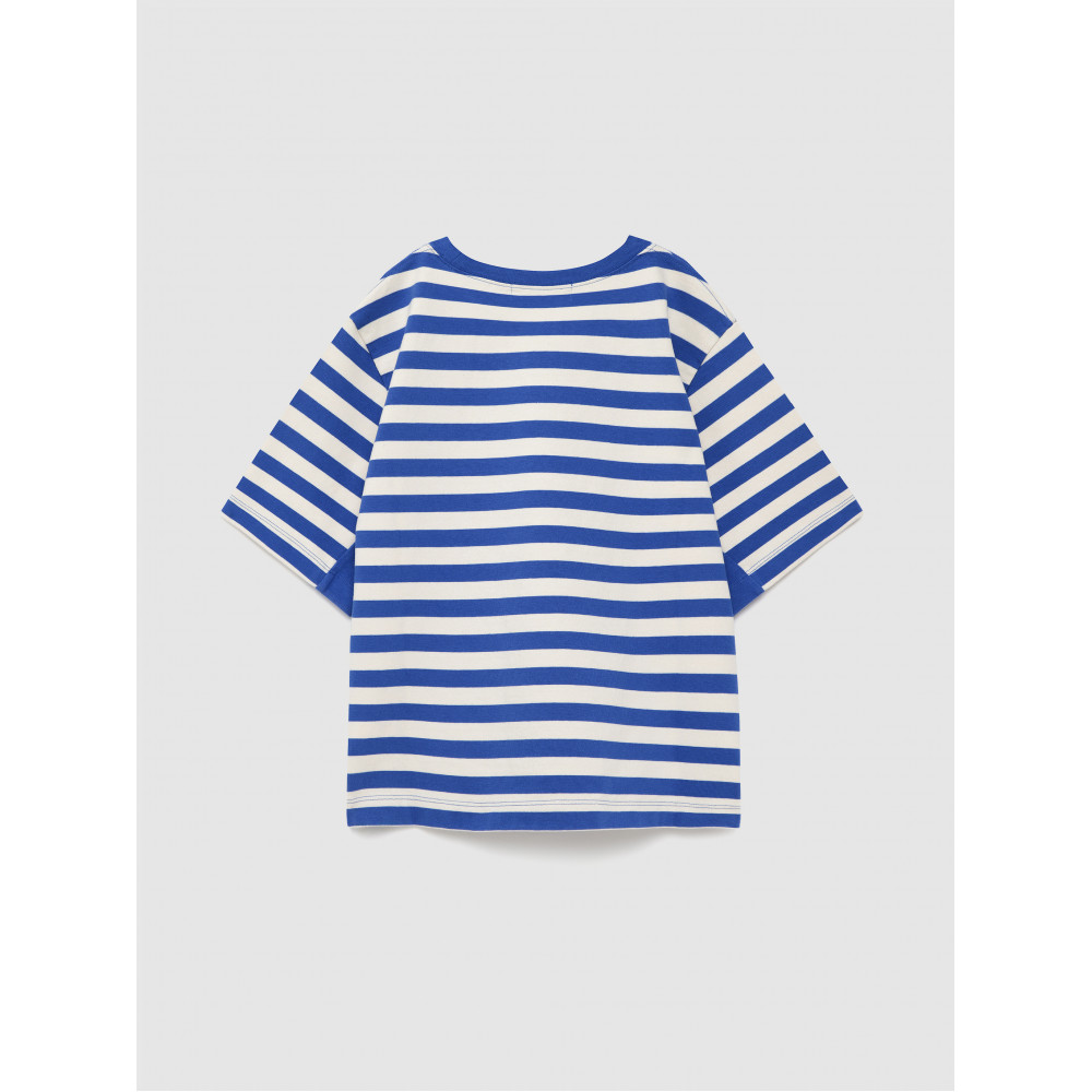 Футболка №11 кольору Lapis Blue виготовлена зі 100% бавовни та має невеликий логотип бренду спереду. Ця футболка з короткими рукавами має смужки, пофарбовані в пряжу, круглий комір та занижені плечі. Вона має вільний крій. Виготовлено в Португалії.