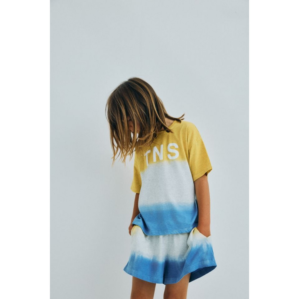 Футболка з меланжевого бавовняного трикотажу з м'яким оздобленням та двоколірним ефектом тай-дай, з принтом TNS спереду. Ідеально поєднується з рештою колекції тай-дай.