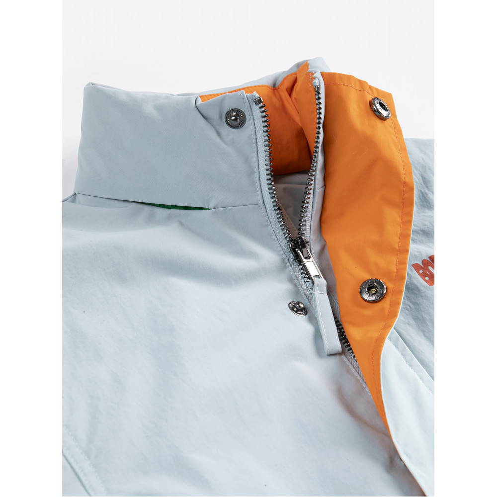 Світло-блакитний дощовик. З капюшоном, довгими рукавами, спущеними плечима, застібкою на кнопці спереду, блискавкою, еластичними манжетами, регульованим шнурком, довжиною вище коліна, високим коміром, кишенею з клапаном, вільним кріслом та водонепроникним.