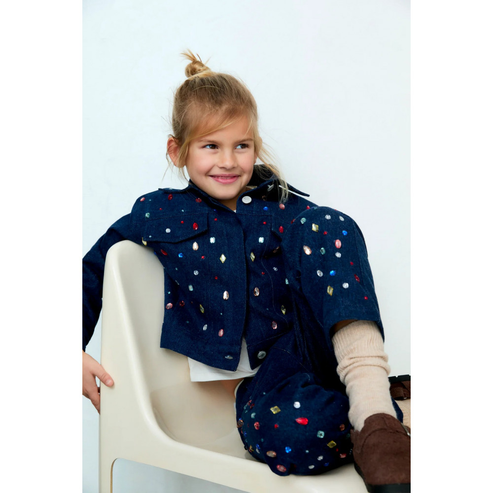 Темні джинсові штани з ручним нанесенням різнокольорових кристалічних деталей спереду для ніжного блиску. Оздоблені вишивкою TNS з люрексу, вони ідеально поєднуються з відповідною курткою, створюючи узгоджений, стильний образ.