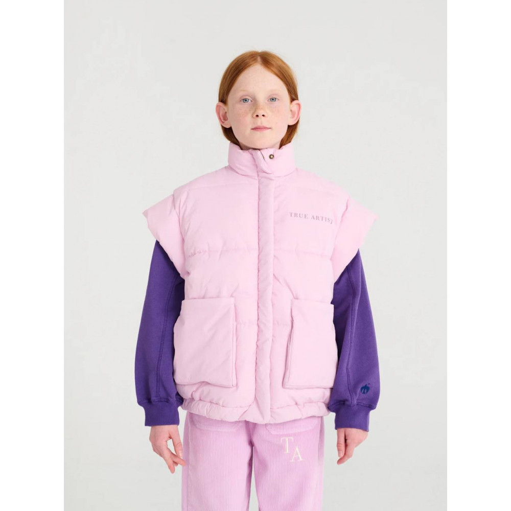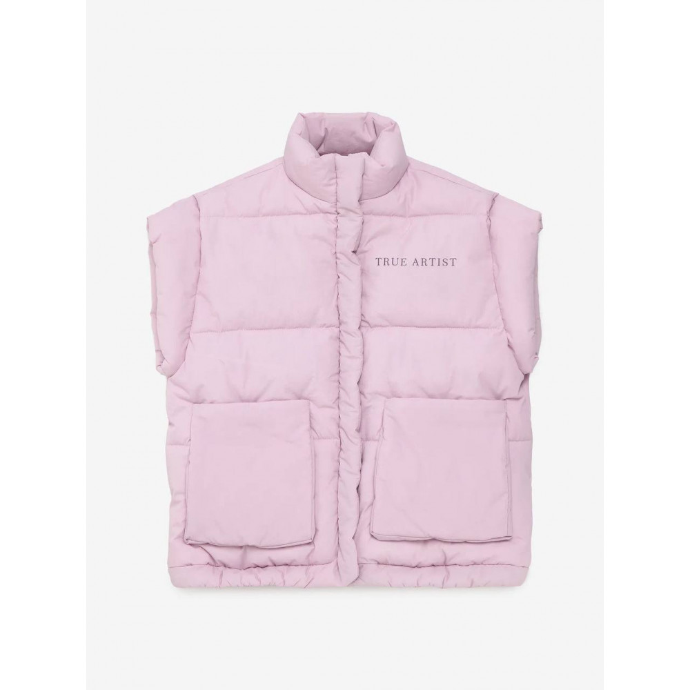 Утеплений жилет №04 кольору Pink Blush виготовлений зі 100% поліаміду. Цей жилет має наш принт TRUE ARTIST на грудях, застібку на блискавку спереду та накладні кишені спереду. Його наповнювач виготовлений зі 100% поліестеру. Він має вільний крій.