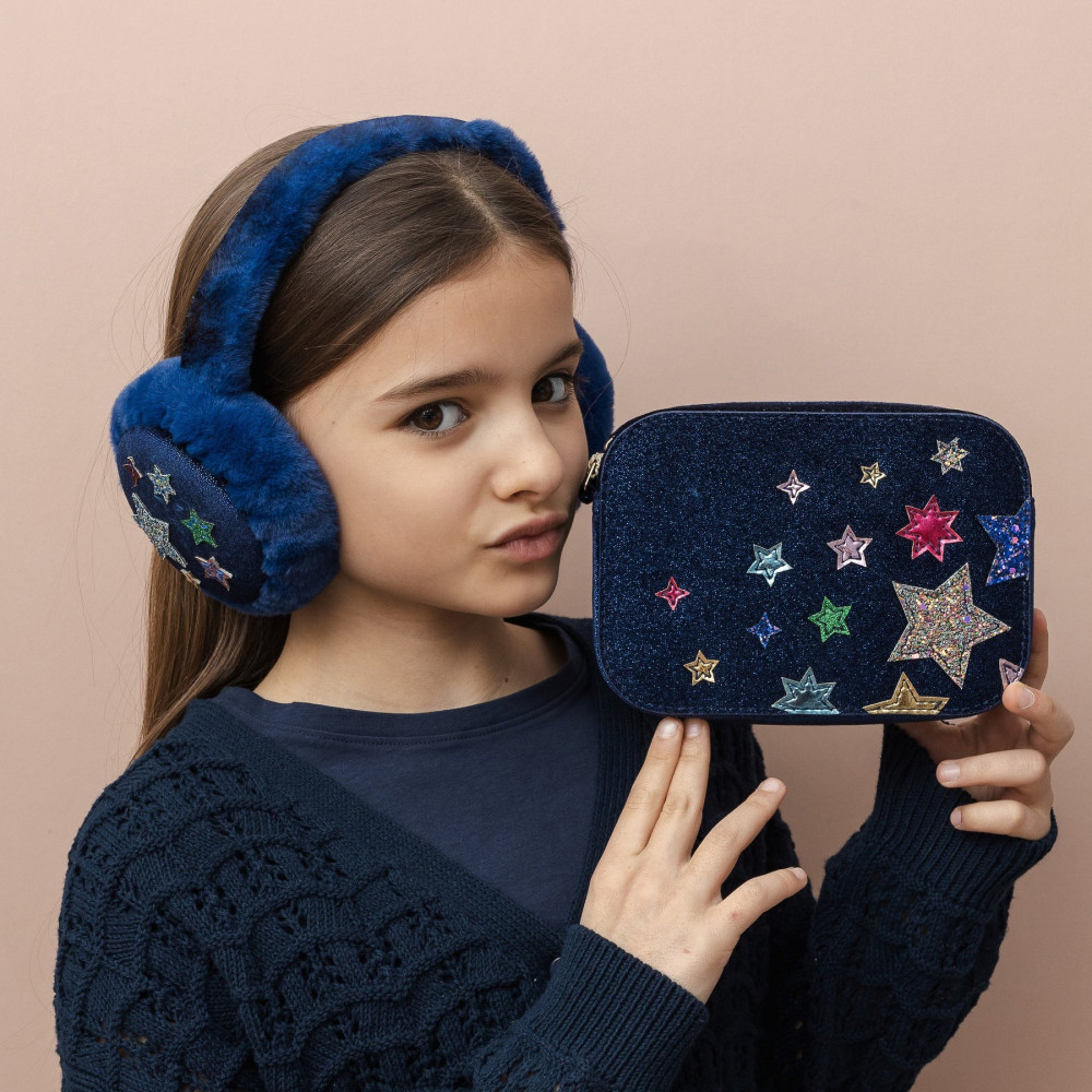 Ця чудова сумка з темно-синього оксамиту ідеально передає красу нічного неба! Завдяки міцній конструкції, просторому внутрішньому шару та надзвичайно гарним зірковим прикрасам, вона стане чудовим подарунком! Виготовлена з надзвичайно м’якого блакитного оксамиту, прикрашеного поєднанням блискіток та металевих тканинних зірок. Розміри сумки приблизно: Ш 17 см x Г 6 см x В 12 см. Застібка на блискавку. Довжина ремінця приблизно 48 см. Увага! Не підходить для дітей віком до 36 місяців.