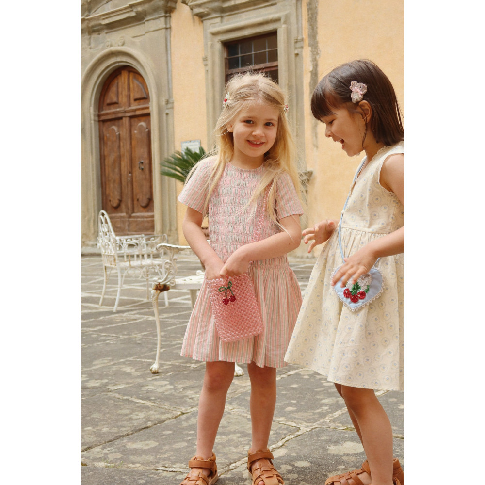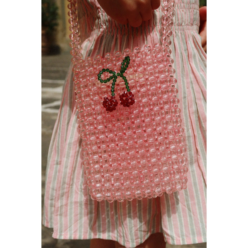 Гаманець з бісером, розроблений як практична сумка через плече, яку легко брати з собою. Виготовлений з нашої фірмової вишні, виготовленої з бісеру. Підходить для дітей віком від 3 років. Зверніть увагу на довгі шнури та дрібні деталі.