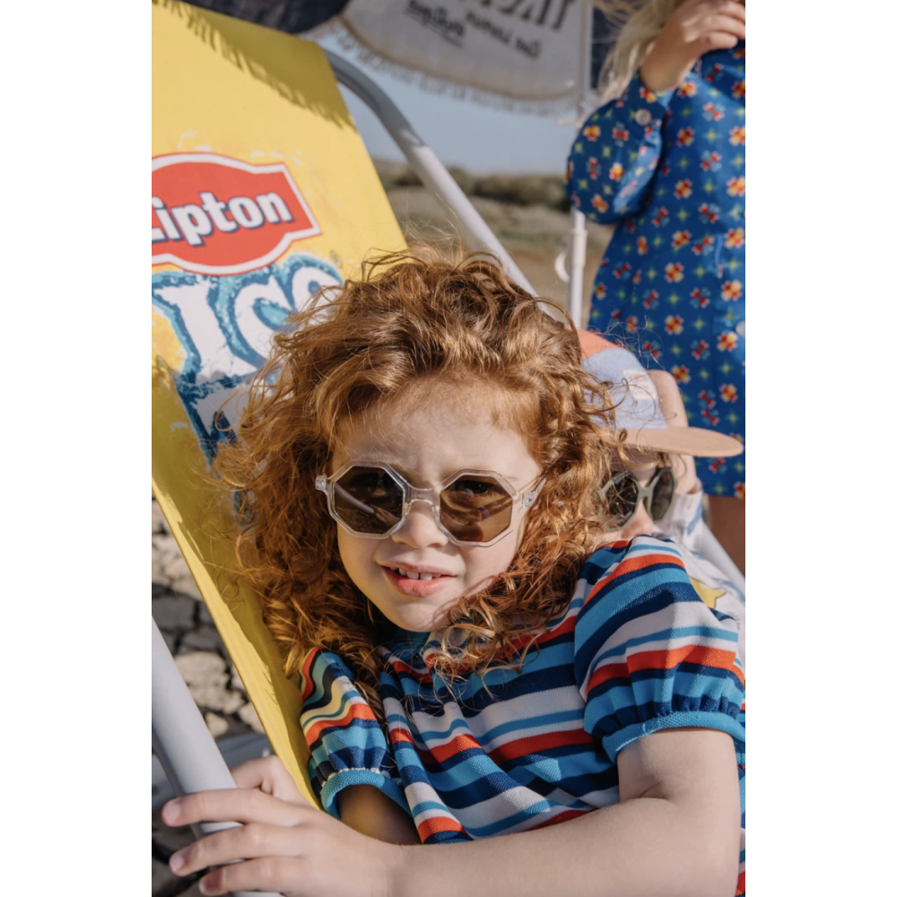 Класні та надзвичайно веселі, сонцезахисні окуляри YEYE були створені, щоб стати ідеальним аксесуаром для вашої дитини, і більше того, вони дійсно захищають її маленькі очі! Один розмір для всіх від 2 до 7 років Окуляри розроблені та виготовлені у Франції, сертифіковані Origine France Garantie Полікарбонатні лінзи також французькі: 100% захист від ультрафіолету, категорія 3. Полікарбонат - ультраударостійкий матеріал! Натуральний, біологічний матеріал, який можна переробити, на основі касторової олії Фетровий мішечок ручної роботи у Франції, сертифікований Oeko-Tex Standard 100 Розмір окулярів: 12 см (ширина обличчя, від скроні до скроні) х 4,5 см (висота восьмикутника) х 11,6 см (довжина дужок)