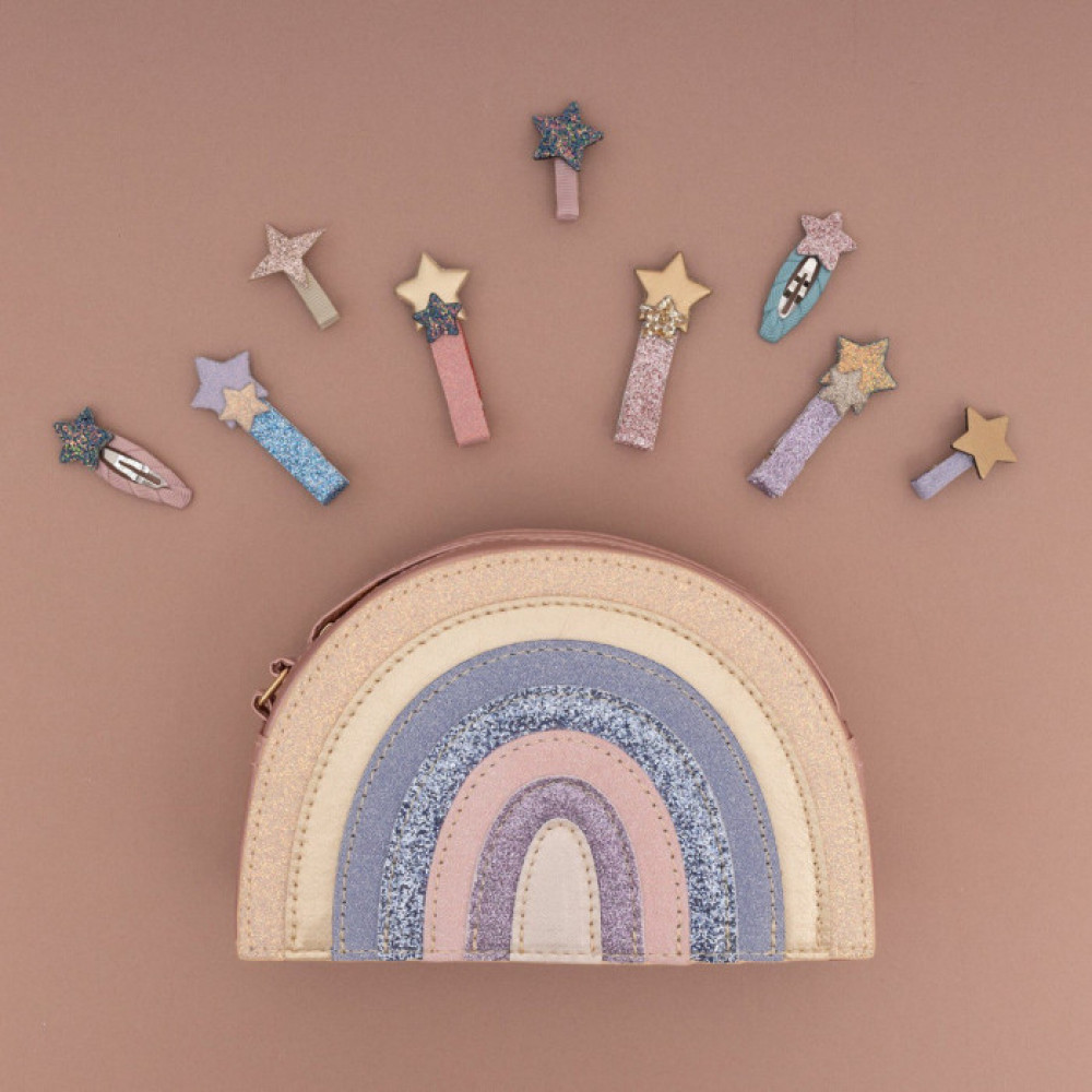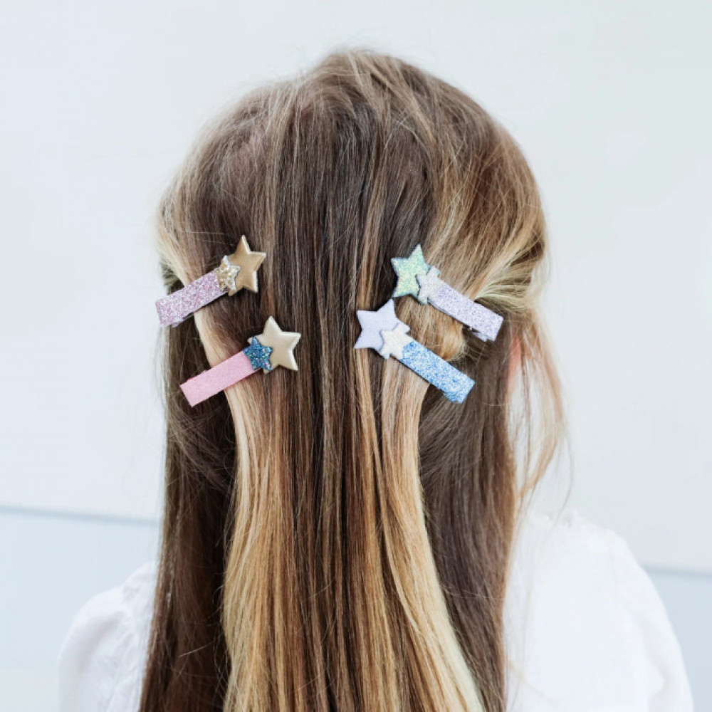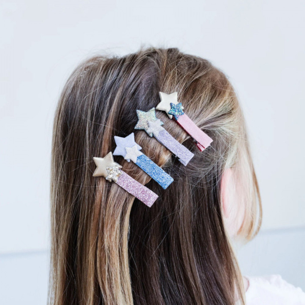 Ці чудові блискучі багатошарові затискачі зі зірками ідеально підходять для того, щоб прибрати волосся назад і додати блиску! 4 в упаковці Приблизно 5 см салонних затискачів, покритих блискучою тканиною