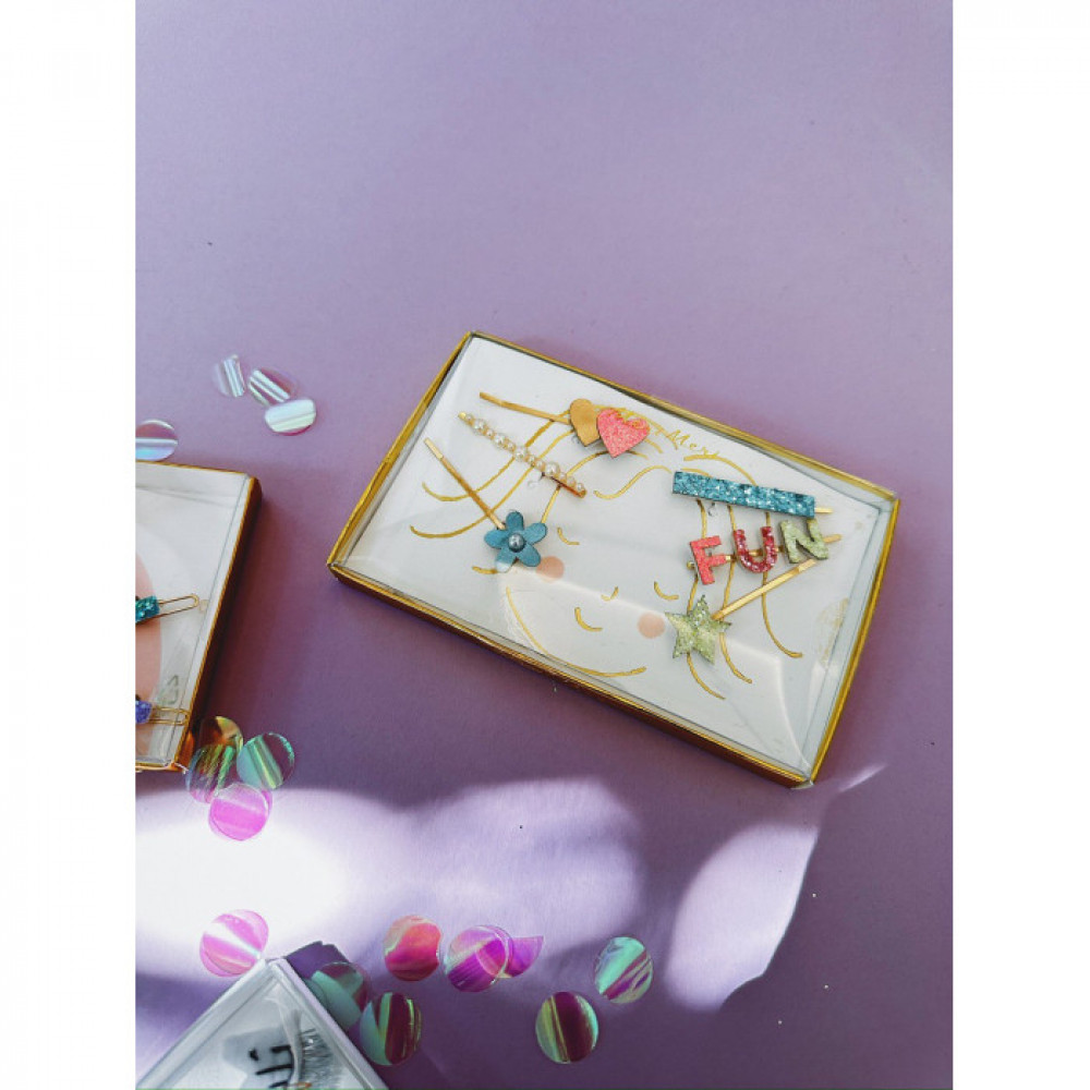 Цей приголомшливий пакет слайдів для волосся пропонує стільки стильних варіантів - блискучі квіти, зірки, сердечка та слово "Fun", а також штучні перли. Широкий вибір на будь-який випадок!