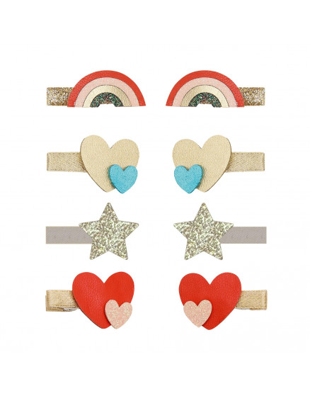 Зробіть кожен день чудовим днем для зачіски з нашими чарівними новими райдужними міні-заколками! Чотири чудові пари на вибір, які можна комбінувати досхочу! 8 в упаковці 3-сантиметрові заколки-крокодилки, обтягнуті тканиною Сердечка, веселки та зірки, виготовлені з чарівного поєднання металевих, блискіткових та м’яких шкіряних тканин