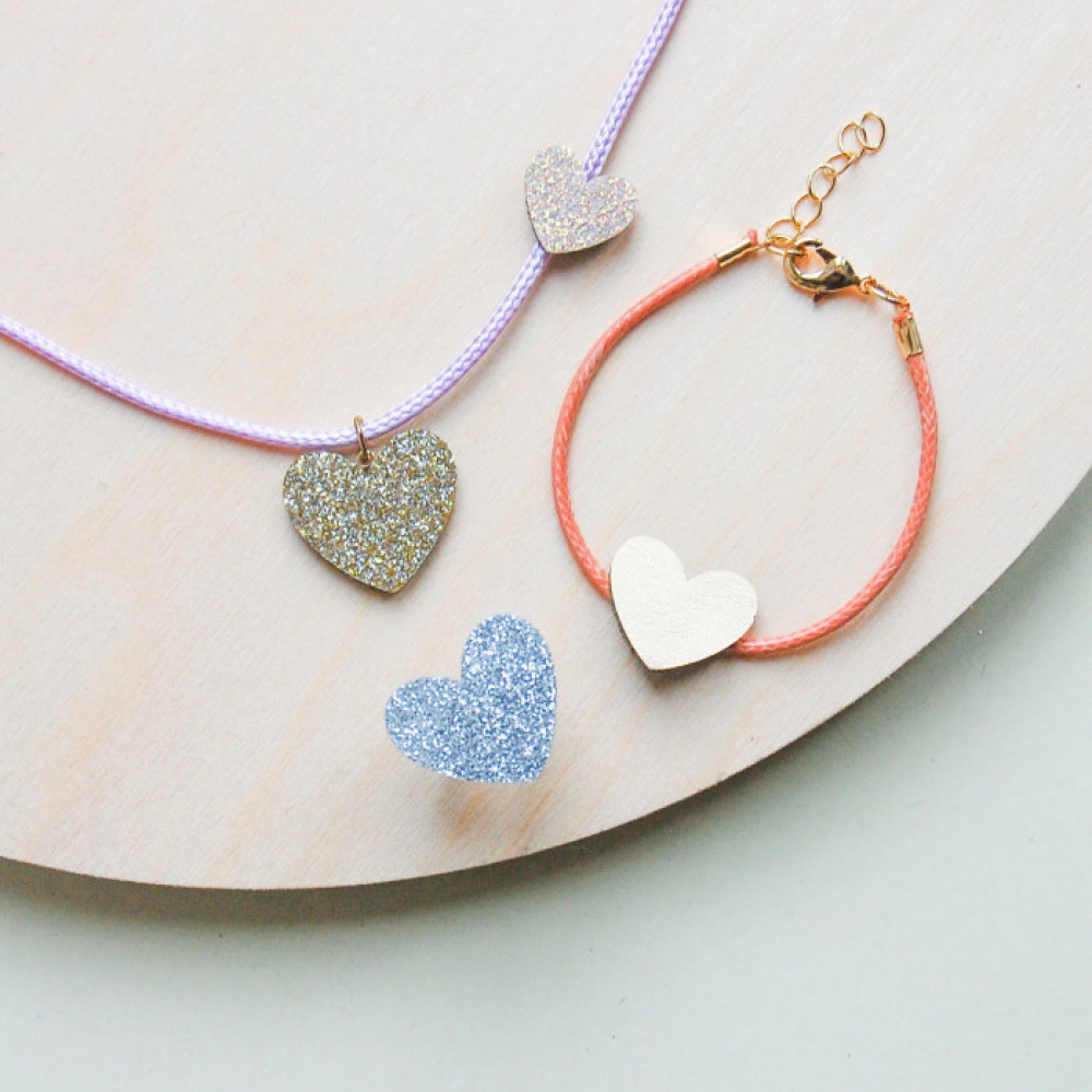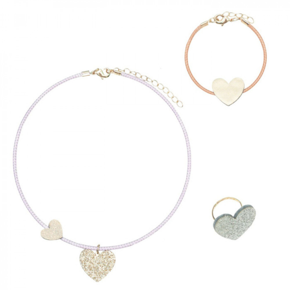Ми дуже раді представити вам... наш чудовий новий набір прикрас у формі серця! Маленькі діти будуть в захваті від цієї гарної трійки блискучих аксесуарів, які ідеально підійдуть для їхнього денного вбрання! Цей гарний набір стане чудовою ідеєю подарунка на всі випадки життя. Набір включає одне намисто, браслет і каблучку з милими маленькими сердечками, виготовленими з блискучої та матової металевої м’якої шкірозамінникової тканини.