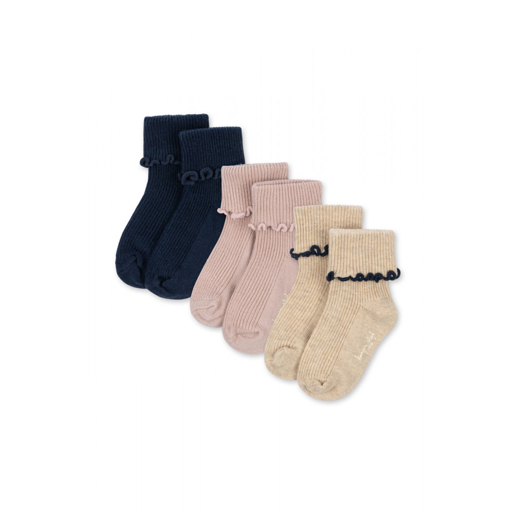 М’які ребристі шкарпетки з комфортною еластичною тканиною та декоративним подолом з рюшами. Милий та зручний предмет гардеробу, що постачається у зручній упаковці з 3 штук – ідеально підходить для щоденного використання. Цей виріб сертифікований DTI Tekstil за стандартом OEKO-TEX® STANDARD 100, клас 1.