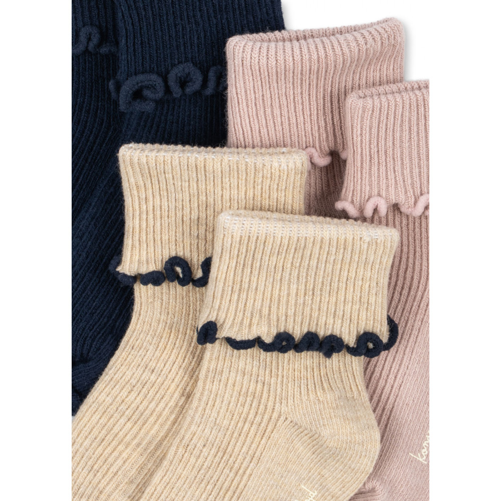 М’які ребристі шкарпетки з комфортною еластичною тканиною та декоративним подолом з рюшами. Милий та зручний предмет гардеробу, що постачається у зручній упаковці з 3 штук – ідеально підходить для щоденного використання. Цей виріб сертифікований DTI Tekstil за стандартом OEKO-TEX® STANDARD 100, клас 1.