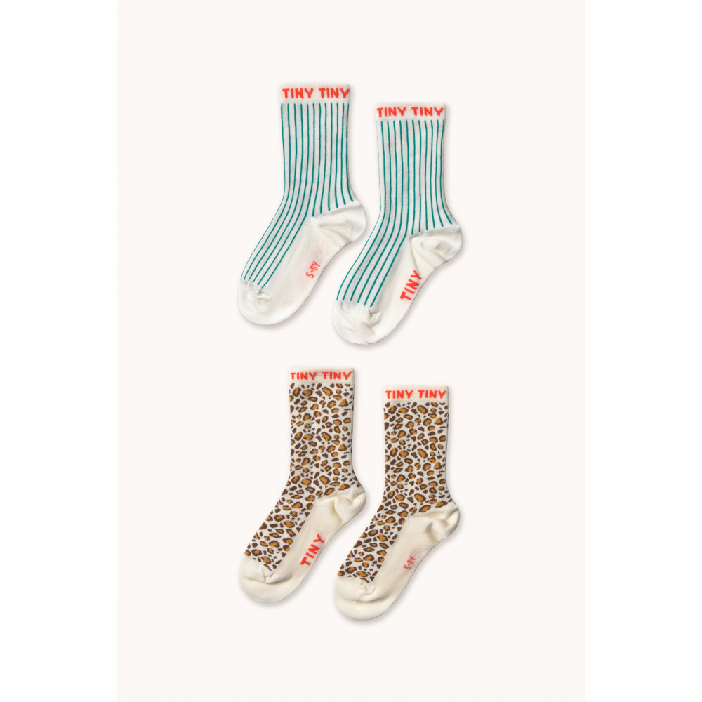Цей набір затишних шкарпеток виготовлений з м’якої суміші вовни. Він включає два сміливі дизайни: один з візерунком «тварина» на кремовому фоні, а інший з тонкими смарагдовими смужками на білій основі. Обидва мають еластичний манжет, прикрашений нашим логотипом. Ідеальний завершальний штрих, який легко додасть будь-якому повсякденному образу вишуканості.