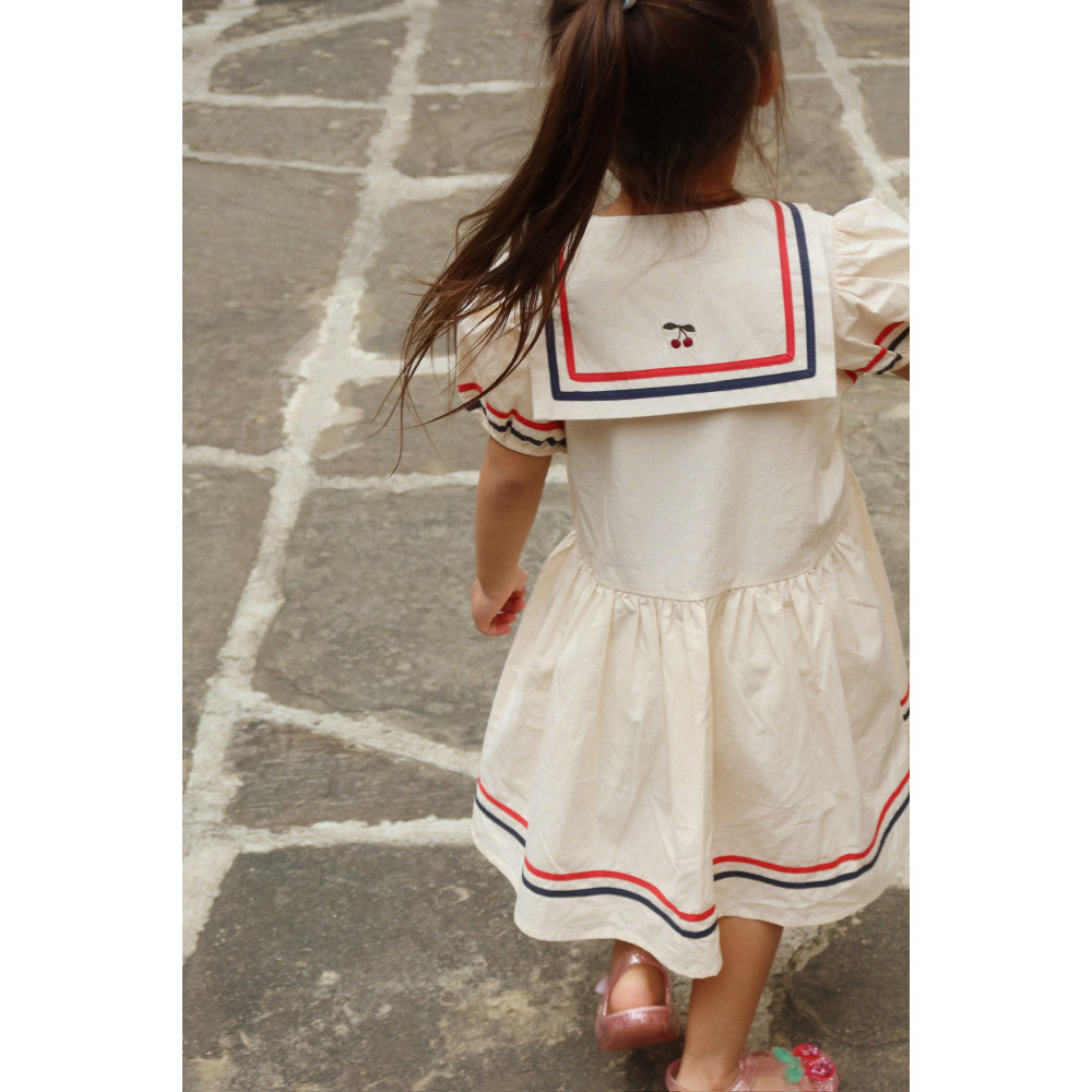 Сукня в моряцькому стилі з м'яким силуетом, великим морським коміром та пишними рукавами. Зібрана на талії для створення привабливого силуету.
