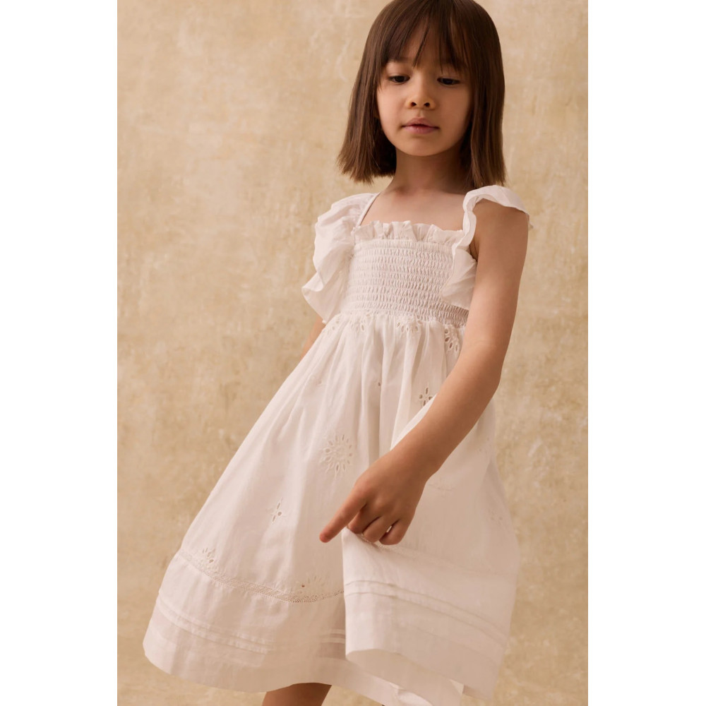 Луїза Міша прагне використовувати найм'якші натуральні матеріали для своїх дитячих виробів. Сукня Anaya, виготовлена з чистої бавовни, має рукави з рюшами та ніжну вишивку по всій поверхні.
