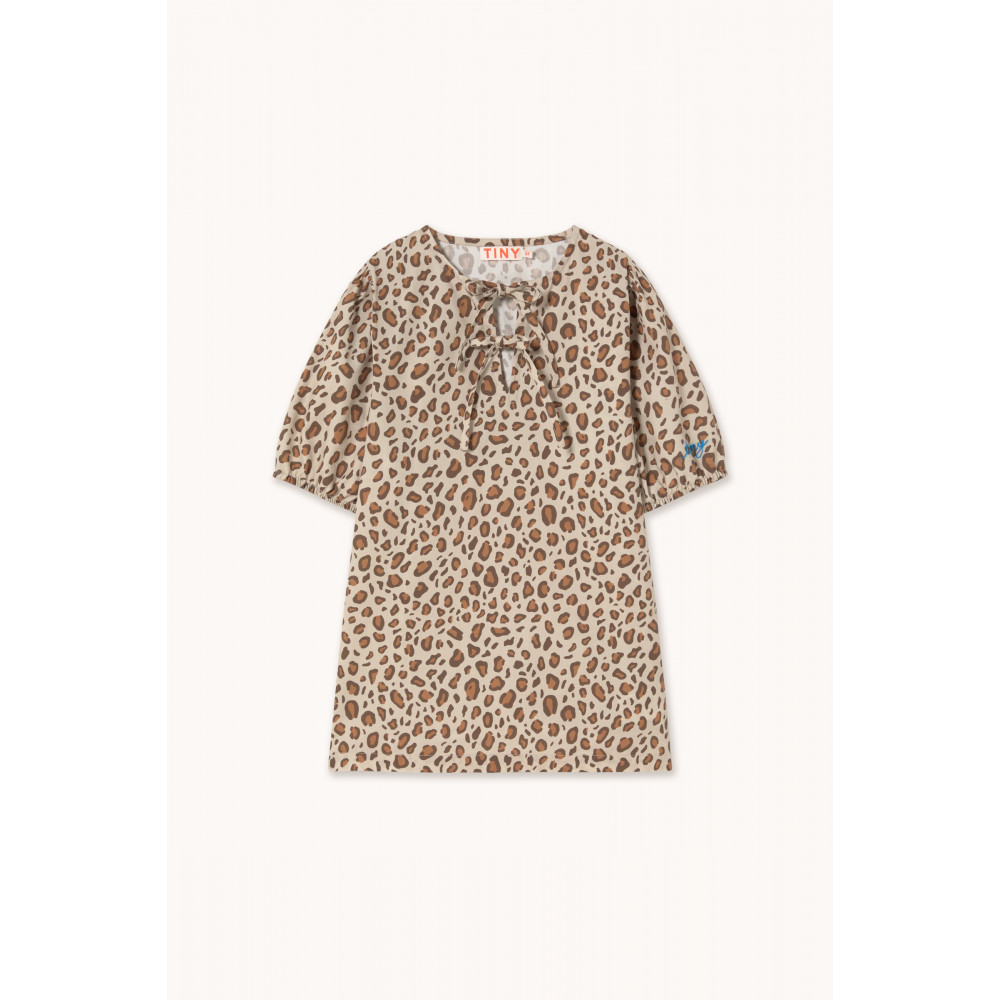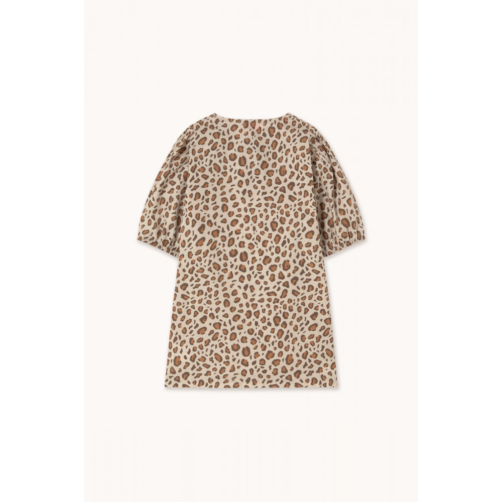 Ця коротка сукня з анімалістичним принтом на темно-ванільній основі поєднує свіжість та стиль у чарівному, універсальному дизайні. Завдяки коротким пишним рукавам на гумці, круглому вирізу горловини та передньому розрізу на зав'язках, вона забезпечує комфортну посадку та невимушений образ. Ідеально підходить для додавання грайливого, природного шарму сонячним дням.