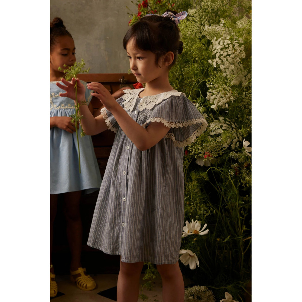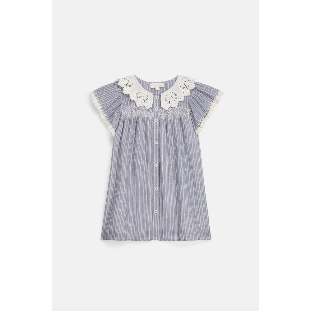 Louise Misha прагне використовувати найм'якші натуральні матеріали для своїх дитячих моделей. Сукня-сорочка Arlina, виготовлена з чистої смугастої бавовни, прикрашена чарівними мереживними деталями на горловині та рукавах.