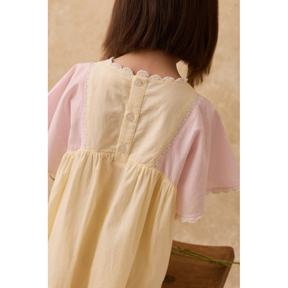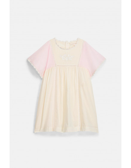 Простора літня сукня з короткими рукавами кольорів морозива: ванільного жовтого та ніжного полунично-рожевого. Вишиті квіти на грудях. Деталі з відкритого мережива між кольоровими вставками та фестончасті деталі на вирізі горловини та подолі рукавів. Збірка на талії для повноти спідниці. Довжина до коліна.