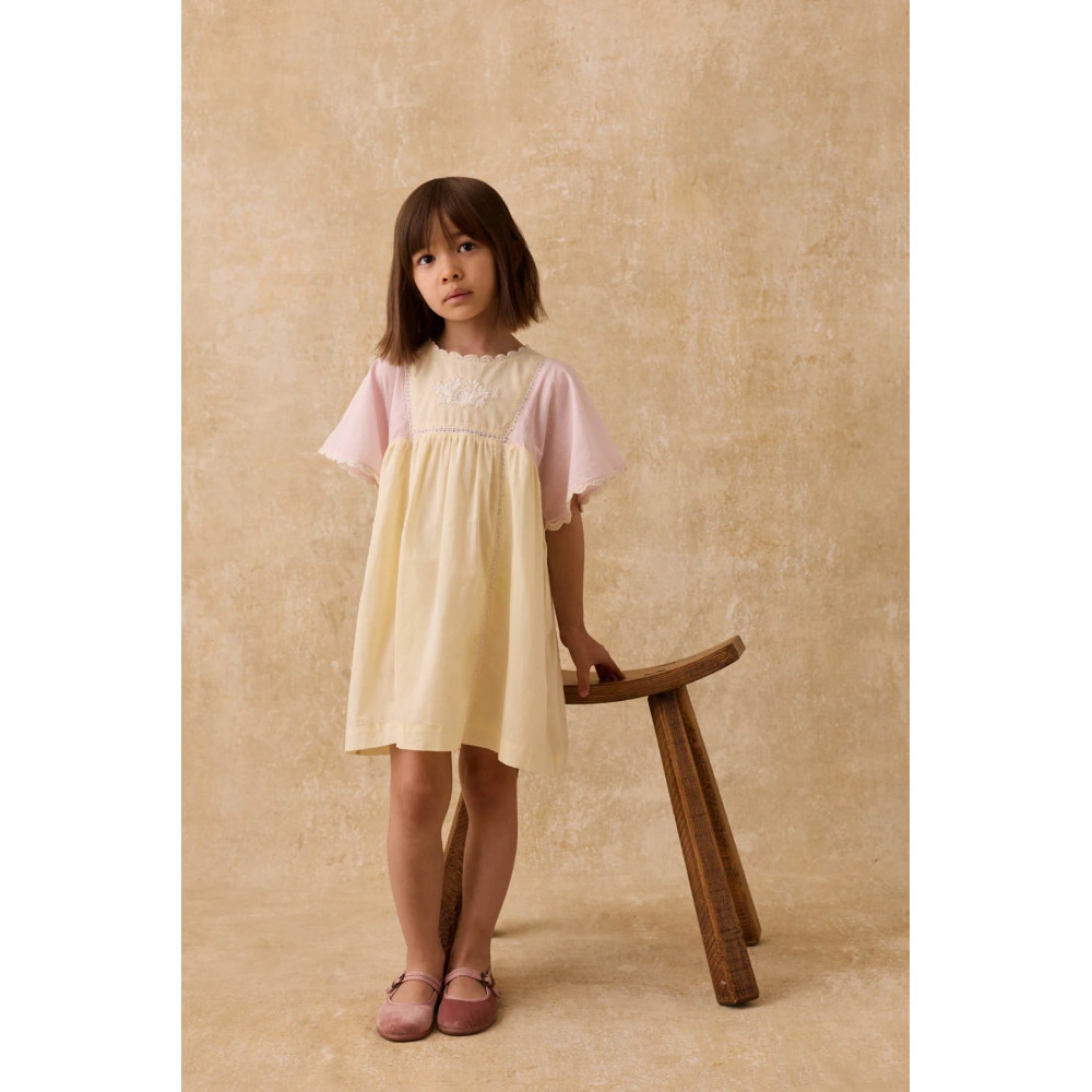 Простора літня сукня з короткими рукавами кольорів морозива: ванільного жовтого та ніжного полунично-рожевого. Вишиті квіти на грудях. Деталі з відкритого мережива між кольоровими вставками та фестончасті деталі на вирізі горловини та подолі рукавів. Збірка на талії для повноти спідниці. Довжина до коліна.