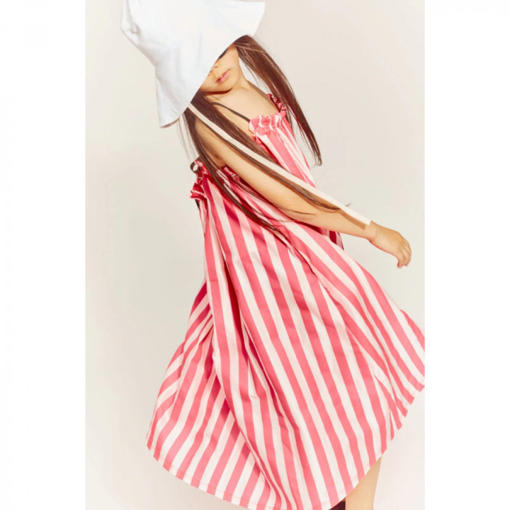 Вільна, плавна посадка, яка спадає до середини гомілки. Доповнюється чорними ремінцями, які додають сміливого штриха загальному образу. Легке, зручне в носінні плаття.