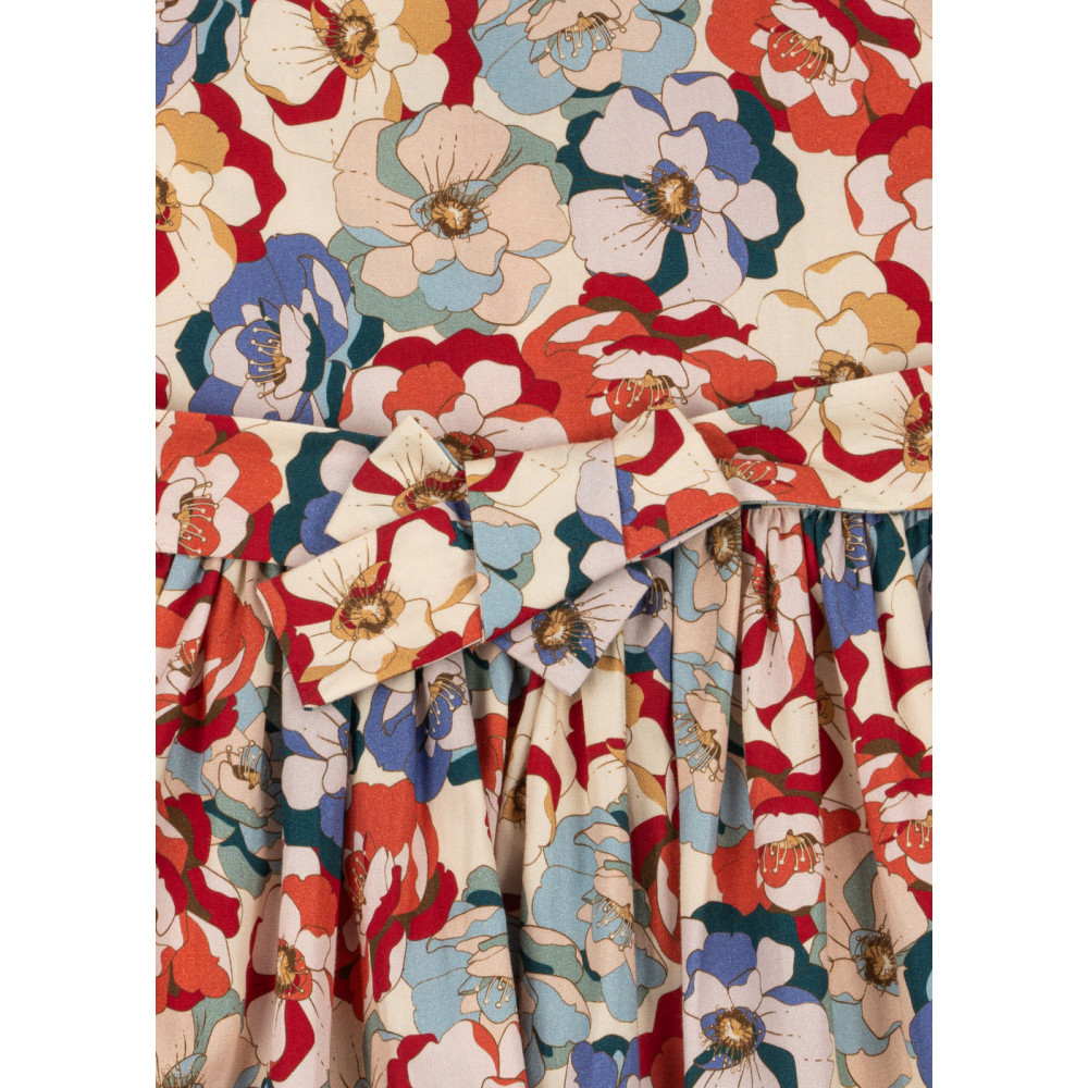 Сукня з органічної бавовни з круглим мереживним коміром, розкльошеною спідницею та пишними рукавами. Виготовлена з тканинними ґудзиками спереду та бретельками, що зав'язуються ззаду для ідеальної посадки.