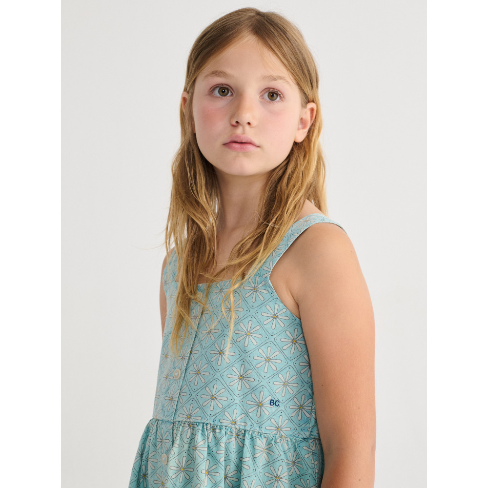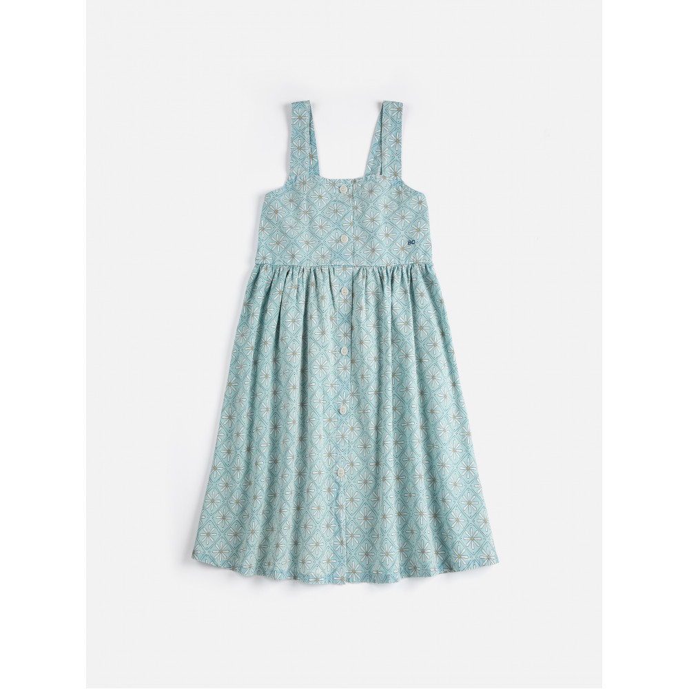 Світло-блакитна сукня. Застібка на ґудзики спереду, складки, вишивка, крій evasé, довжина вище коліна, квадратний виріз горловини та широкі бретелі.