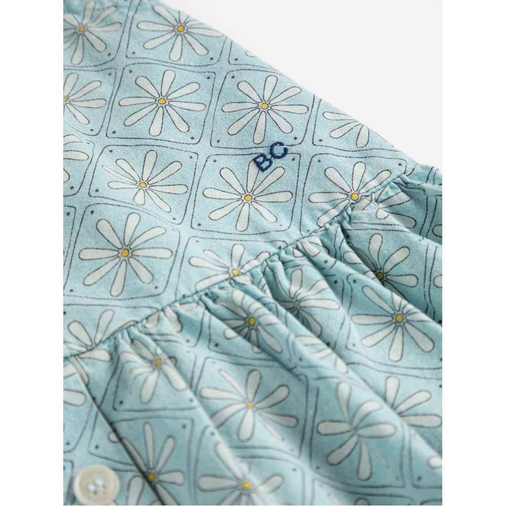 Світло-блакитна сукня. Застібка на ґудзики спереду, складки, вишивка, крій evasé, довжина вище коліна, квадратний виріз горловини та широкі бретелі.