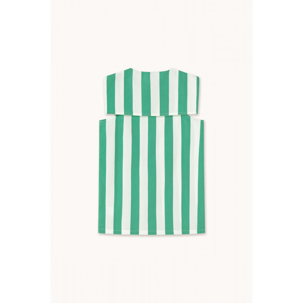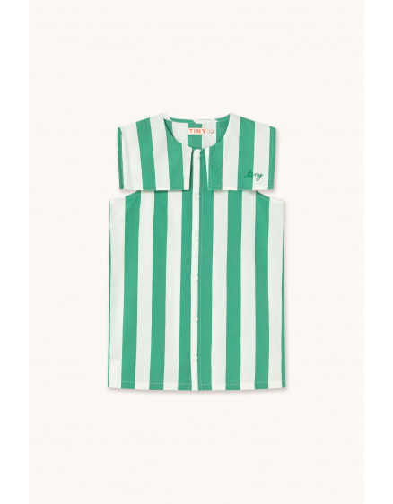 Ця коротка сукня без рукавів з принтом у смарагдові смужки на брудно-білій основі поєднує стиль і комфорт у милому, універсальному дизайні. Завдяки квадратному матросському коміру та застібці на ґудзиках спереду, вона забезпечує комфортну посадку, класичний вигляд і сучасний штрих. Ідеально підходить для сонячних днів і чарівних повсякденних випадків.