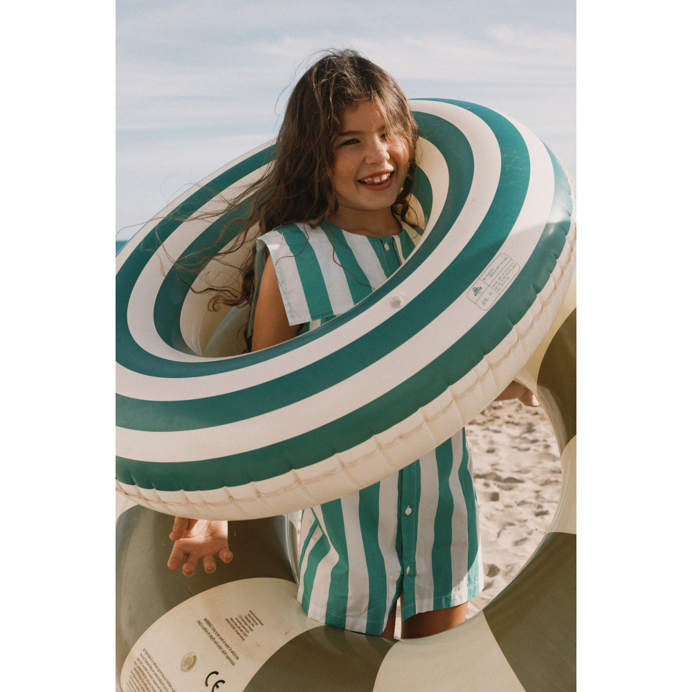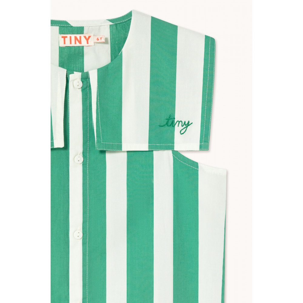 Ця коротка сукня без рукавів з принтом у смарагдові смужки на брудно-білій основі поєднує стиль і комфорт у милому, універсальному дизайні. Завдяки квадратному матросському коміру та застібці на ґудзиках спереду, вона забезпечує комфортну посадку, класичний вигляд і сучасний штрих. Ідеально підходить для сонячних днів і чарівних повсякденних випадків.