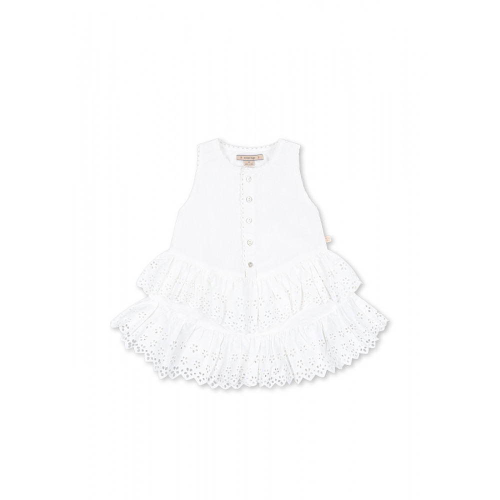 Літня сукня з органічної бавовни з ніжною обробкою з люверсів по низу верхньої частини та об'ємною спідницею з м'якими шарами романтичної англійської вишивки. Класичний літній виріб, який можна носити для будь-яких подій: від урочистих подій до повсякденних моментів.