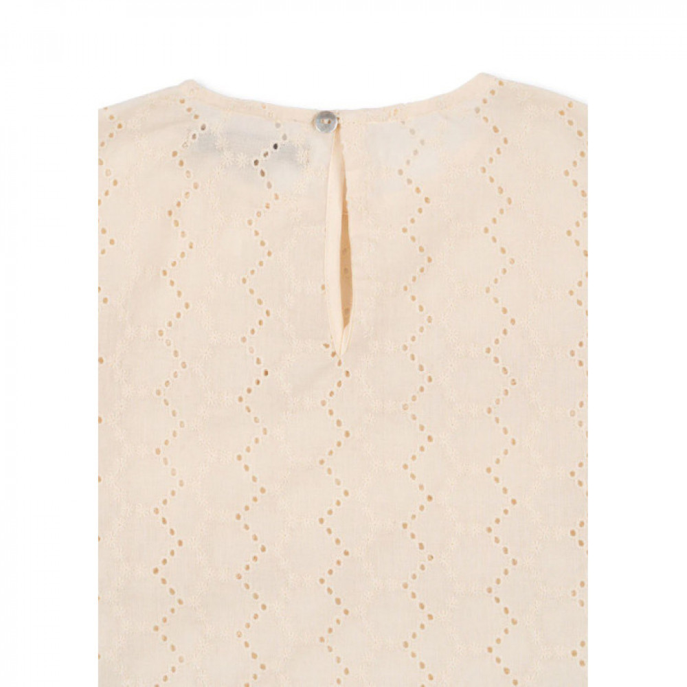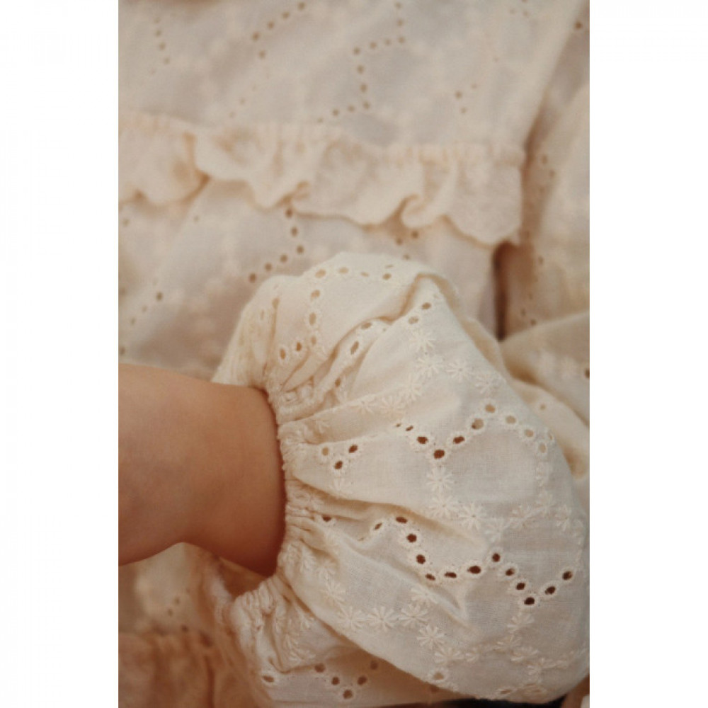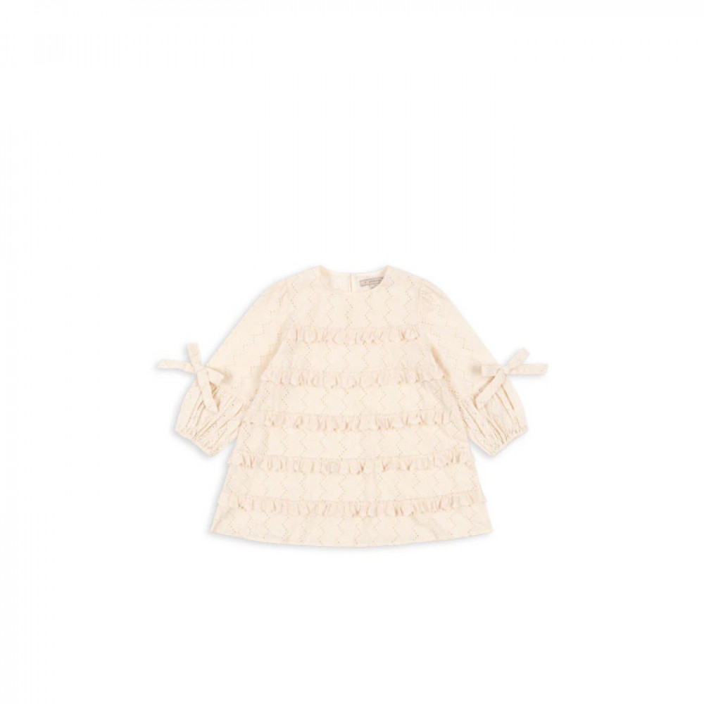 М’яка бавовняна сукня в тонкому англійському стилі з оборками по всій поверхні. Розроблено з еластичними манжетами.