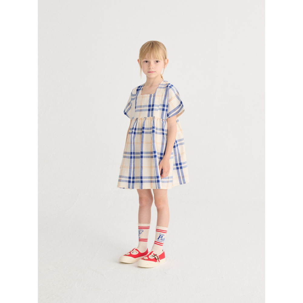 Короткі рукави, застібка на ґудзики ззаду, складки, крій evasé, довжина вище коліна та квадратний виріз горловини.
