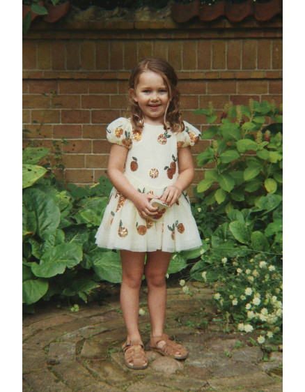Сукня з м'якого фатину з блискітками по всій поверхні. Короткі пишні рукави та об'ємна спідниця, що майорить під час руху. Підкладка з м'якої бавовни для комфортної посадки.