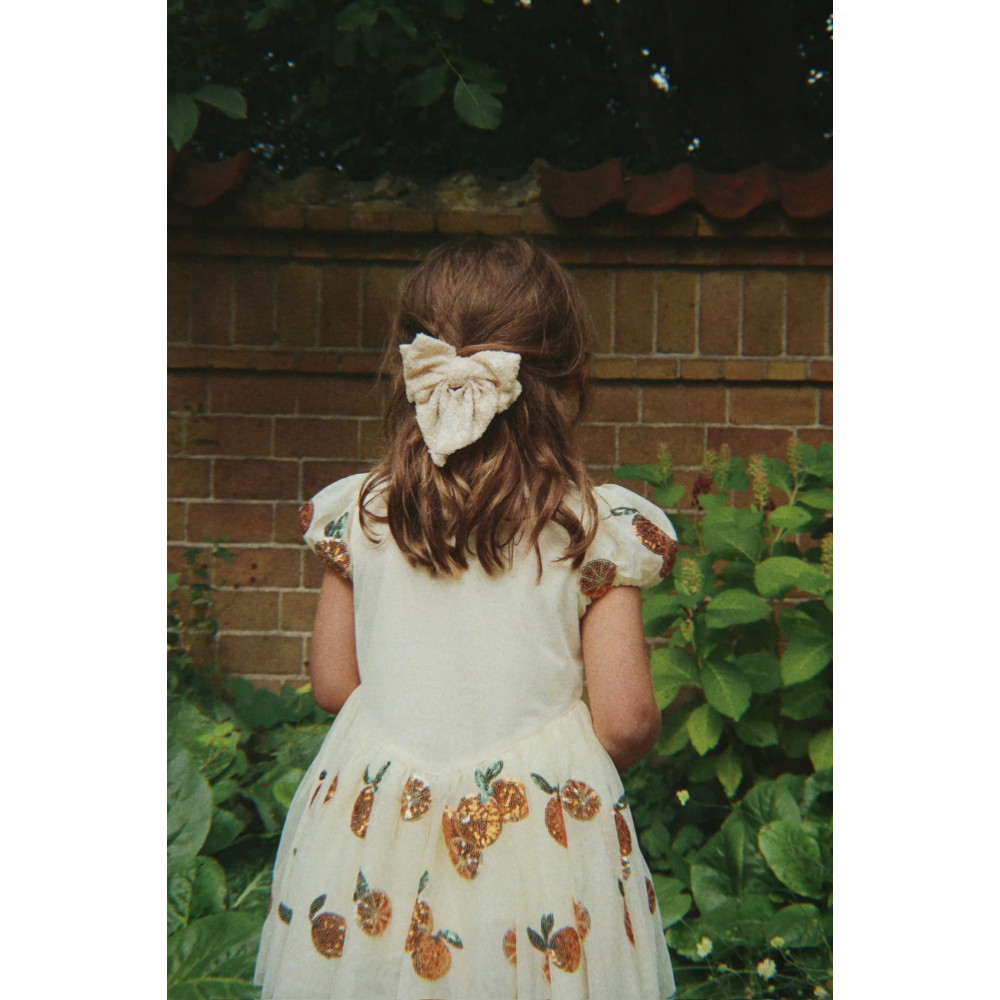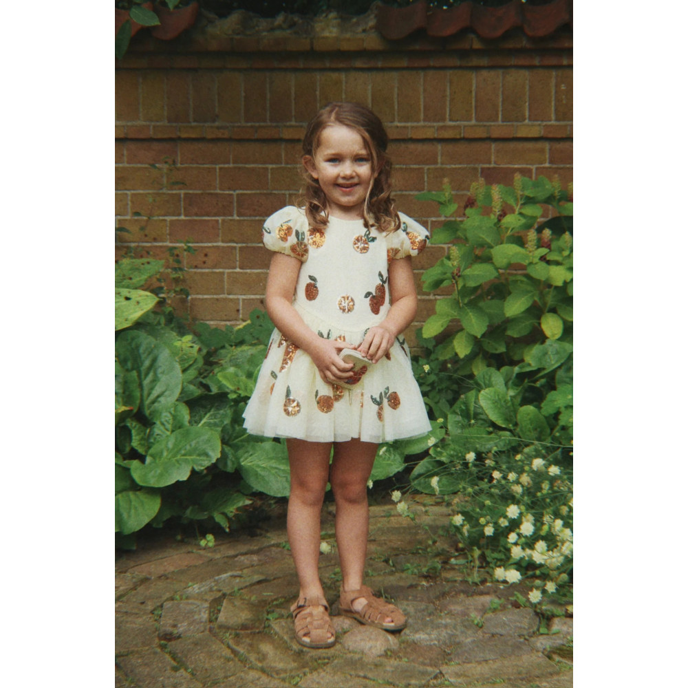 Сукня з м'якого фатину з блискітками по всій поверхні. Короткі пишні рукави та об'ємна спідниця, що майорить під час руху. Підкладка з м'якої бавовни для комфортної посадки.