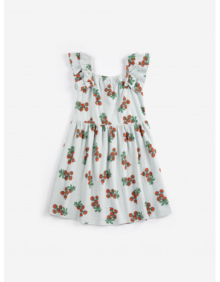 Світло-блакитна сукня. Модель на бретелях, крій evasé, довжина вище коліна, квадратний виріз горловини, одні ручки та рюші.