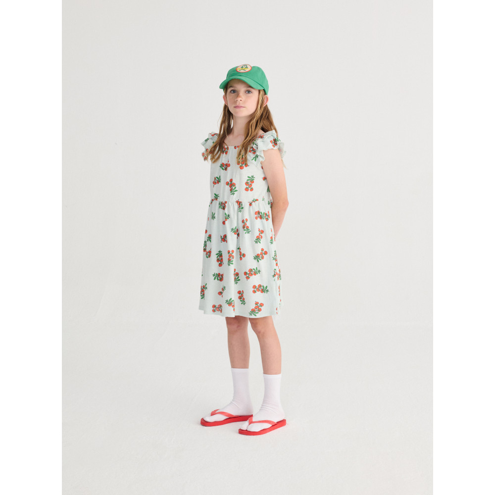 Світло-блакитна сукня. Модель на бретелях, крій evasé, довжина вище коліна, квадратний виріз горловини, одні ручки та рюші.