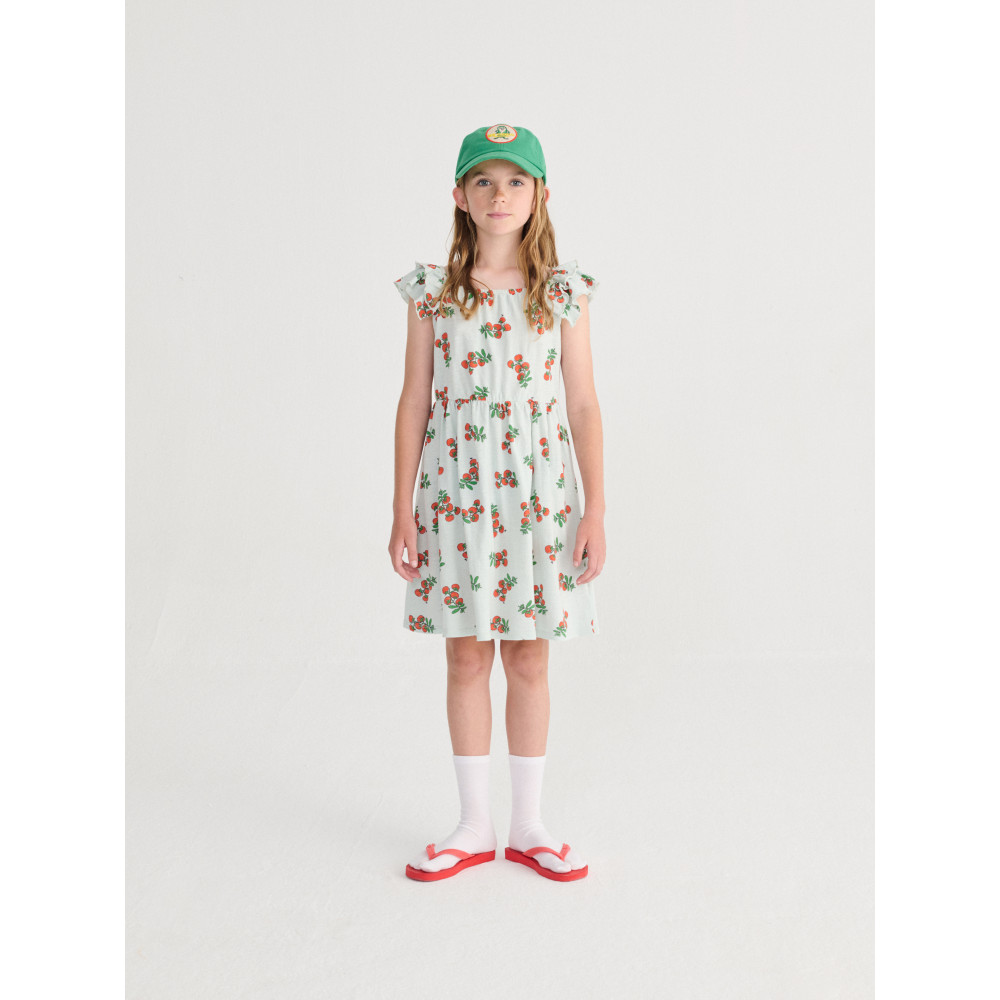 Світло-блакитна сукня. Модель на бретелях, крій evasé, довжина вище коліна, квадратний виріз горловини, одні ручки та рюші.
