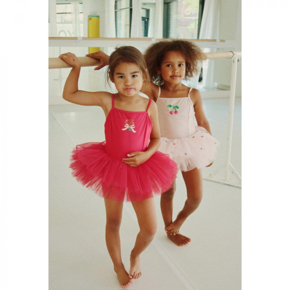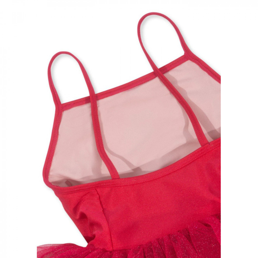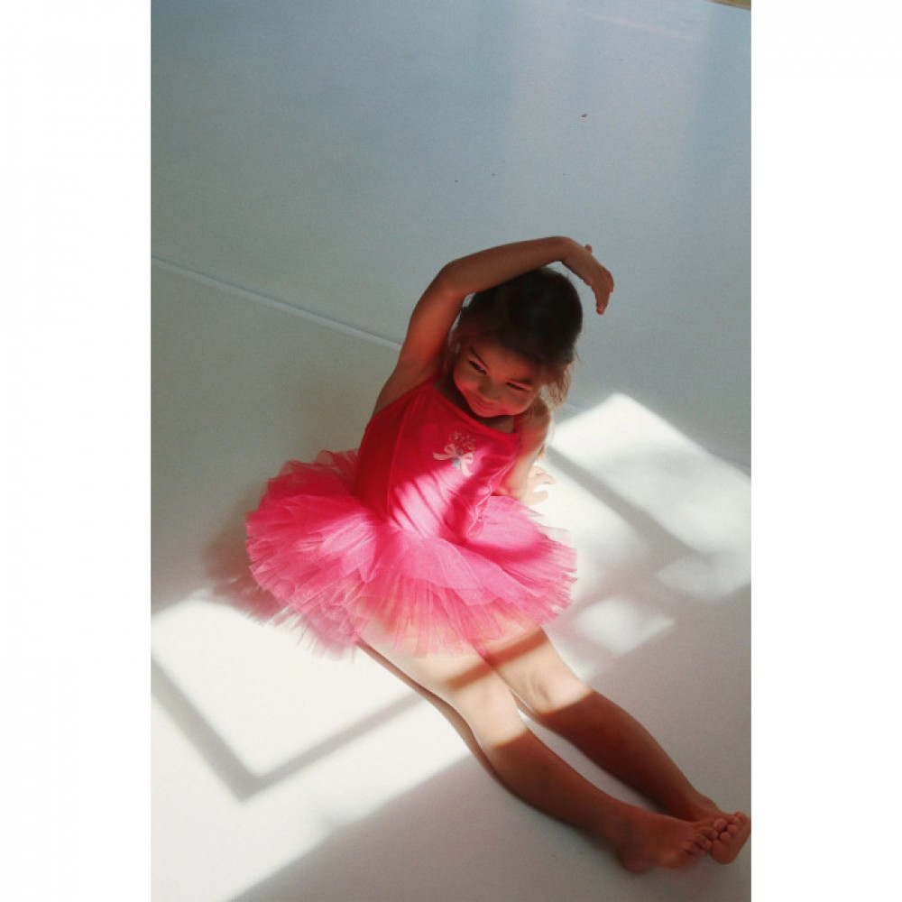 Класичне плаття-пачка для маленьких балерин. Розроблено з об’ємною спідницею з фатину, яка кріпиться до приталеного костюма з еластичної тканини.