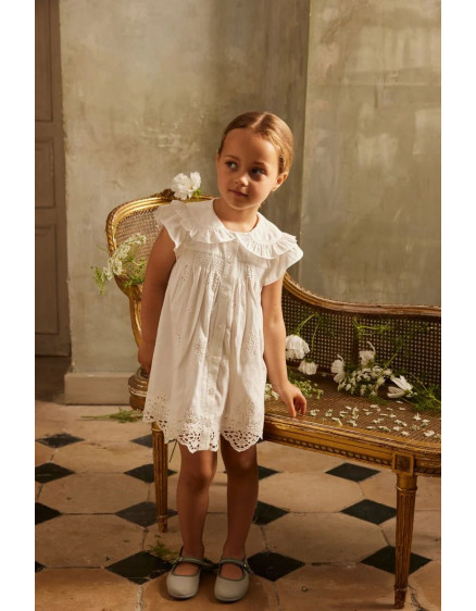 Сукня з однотонної бавовняної тканини з вишивкою на люверсах по всій поверхні. Великий комір з рюшами.