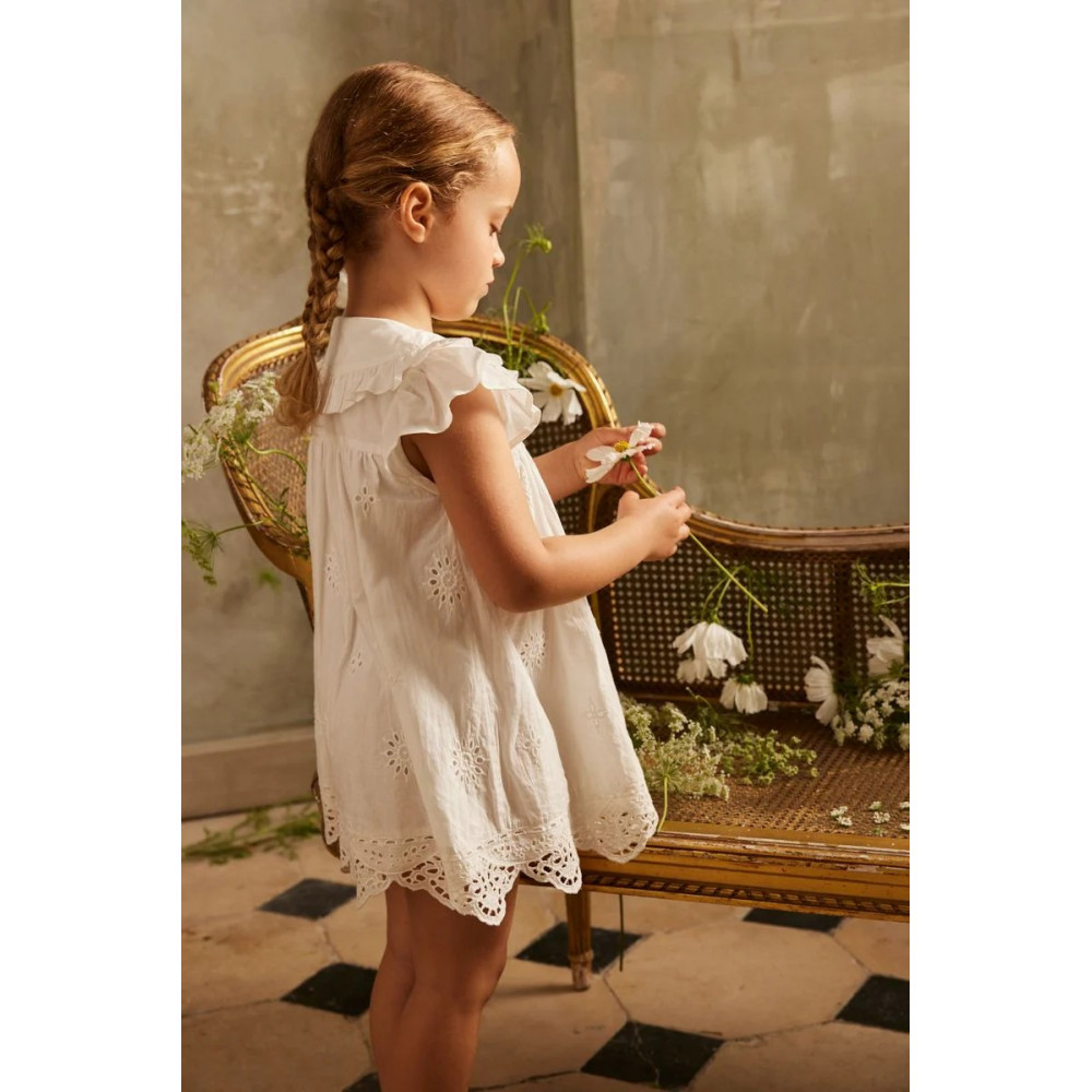 Сукня з однотонної бавовняної тканини з вишивкою на люверсах по всій поверхні. Великий комір з рюшами.
