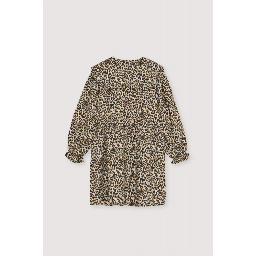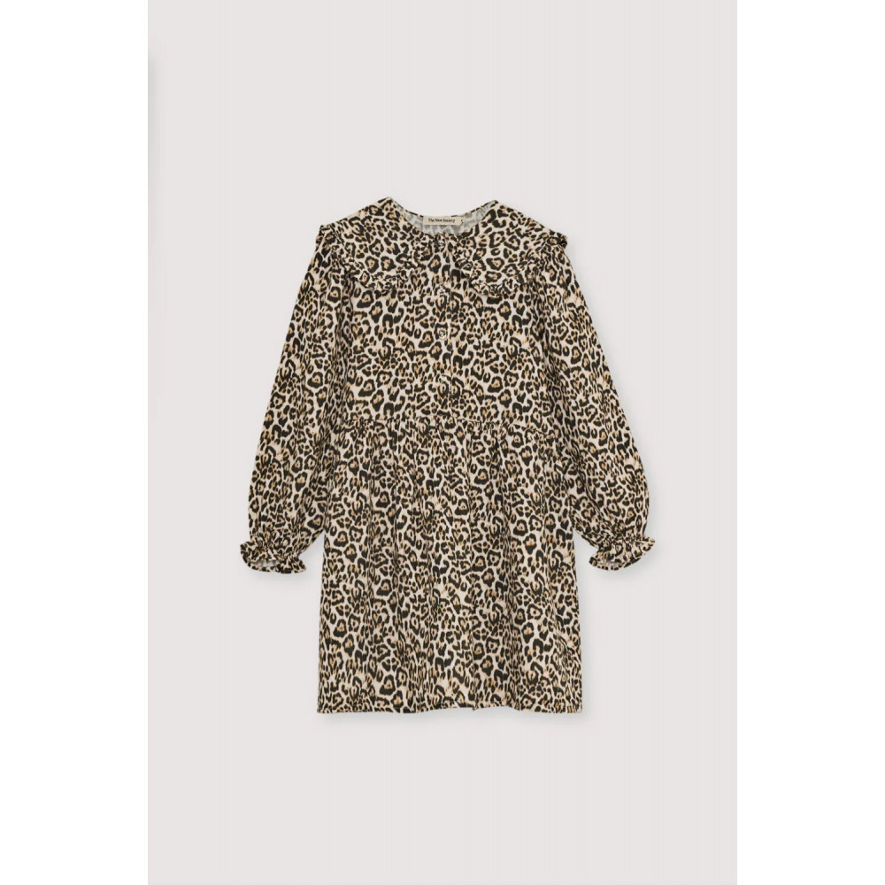 Ця коротка сукня виготовлена з м’якої подвійної бавовняної тканини та має леопардовий принт по всій поверхні, що створює грайливий та стильний образ. Вона має ніжний комірець, передній отвір з тканинними ґудзиками та зібрану талію для комфортної та привабливої посадки. Зріст моделі 126 см, розмір 6Y. Зроблено в Португалії.
